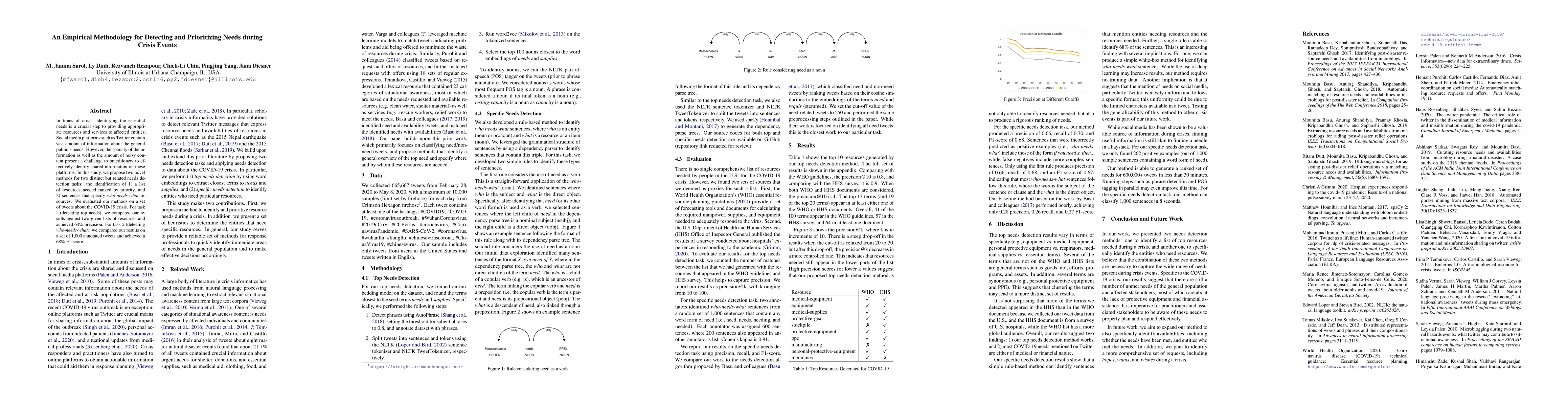 In times of crisis, identifying the essential needs is a crucial step to providing appropriate resources and services to affected entities. Social media platforms such as Twitter contain vast amount of information about the general public's needs. However, the sparsity of the information as well as the amount of noisy content present a challenge to practitioners to effectively identify shared information on these platforms. In this study, we propose two novel methods for two distinct but related needs detection tasks: the identification of 1) a list of resources needed ranked by priority, and 2) sentences that specify who-needs-what resources. We evaluated our methods on a set of tweets about the COVID-19 crisis. For task 1 (detecting top needs), we compared our results against two given lists of resources and achieved 64% precision. For task 2 (detecting who-needs-what), we compared our results on a set of 1,000 annotated tweets and achieved a 68% F1-score.