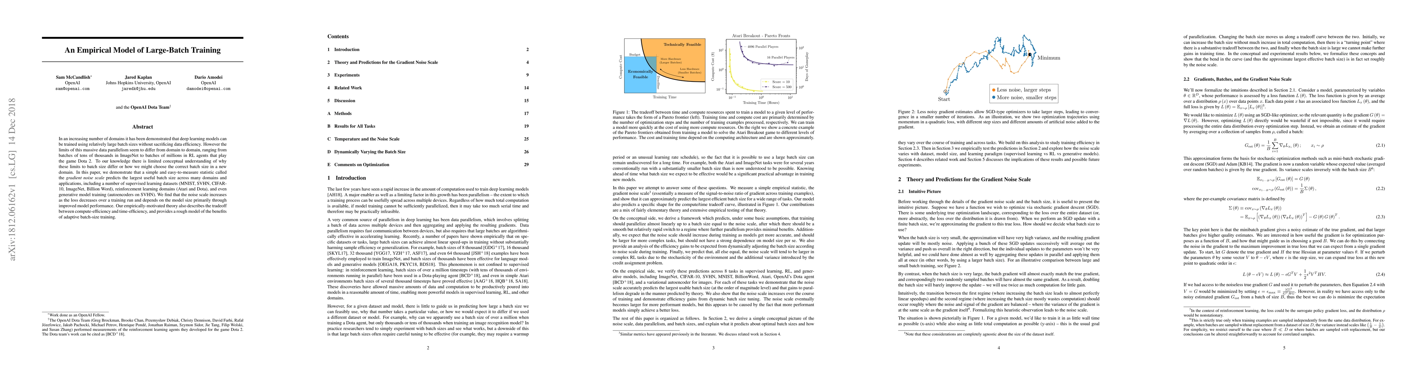 In an increasing number of domains it has been demonstrated that deep learning models can be trained using relatively large batch sizes without sacrificing data efficiency. However the limits of this massive data parallelism seem to differ from domain to domain, ranging from batches of tens of thousands in ImageNet to batches of millions in RL agents that play the game Dota 2. To our knowledge there is limited conceptual understanding of why these limits to batch size differ or how we might choose the correct batch size in a new domain. In this paper, we demonstrate that a simple and easy-to-measure statistic called the gradient noise scale predicts the largest useful batch size across many domains and applications, including a number of supervised learning datasets (MNIST, SVHN, CIFAR-10, ImageNet, Billion Word), reinforcement learning domains (Atari and Dota), and even generative model training (autoencoders on SVHN). We find that the noise scale increases as the loss decreases over a training run and depends on the model size primarily through improved model performance. Our empirically-motivated theory also describes the tradeoff between compute-efficiency and time-efficiency, and provides a rough model of the benefits of adaptive batch-size training.