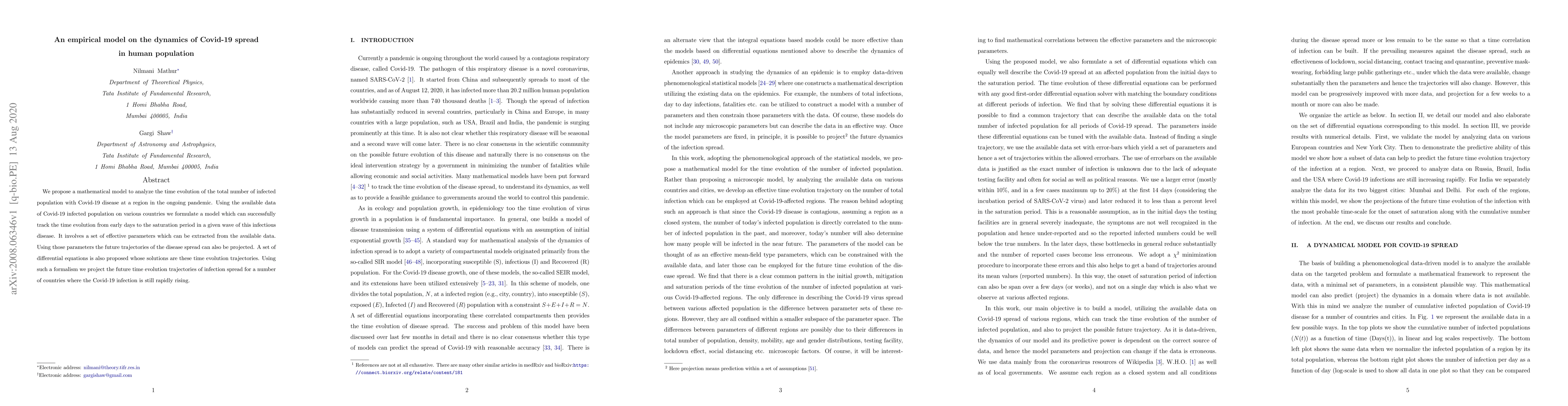 This study proposes a mathematical model to track Covid-19 infection spread, using available data to predict future trajectories for countries still experiencing rapid increases in cases.