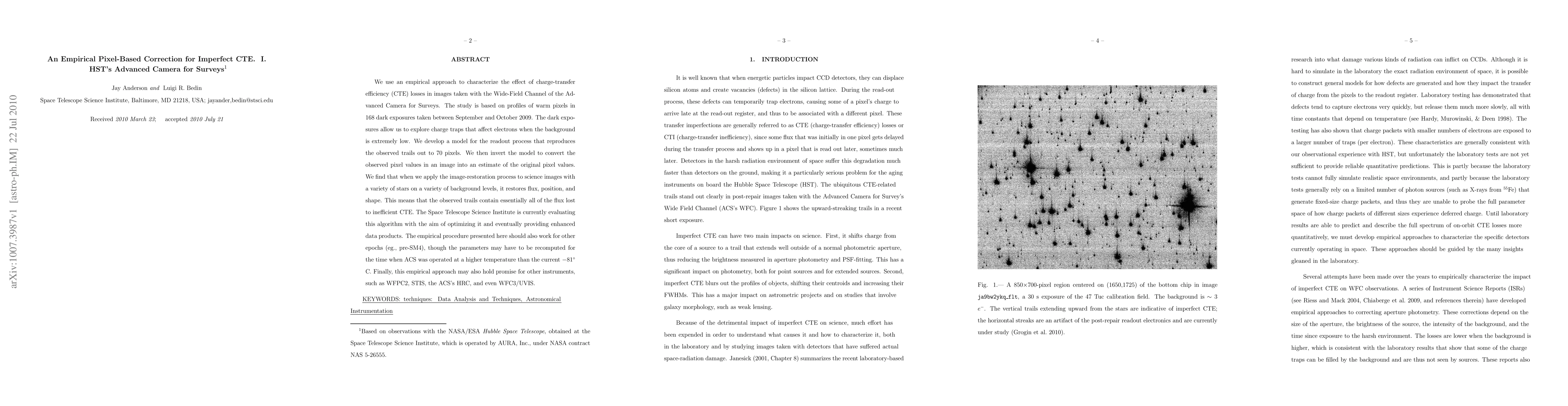 This paper presents an empirical pixel-based correction method to address charge-transfer efficiency (CTE) losses in images from the Advanced Camera for Surveys' Wide-Field Channel. The study uses dark exposures to develop a model that restores lost flux, position, and shape in science images, and the method shows potential for application to other instruments and epochs.