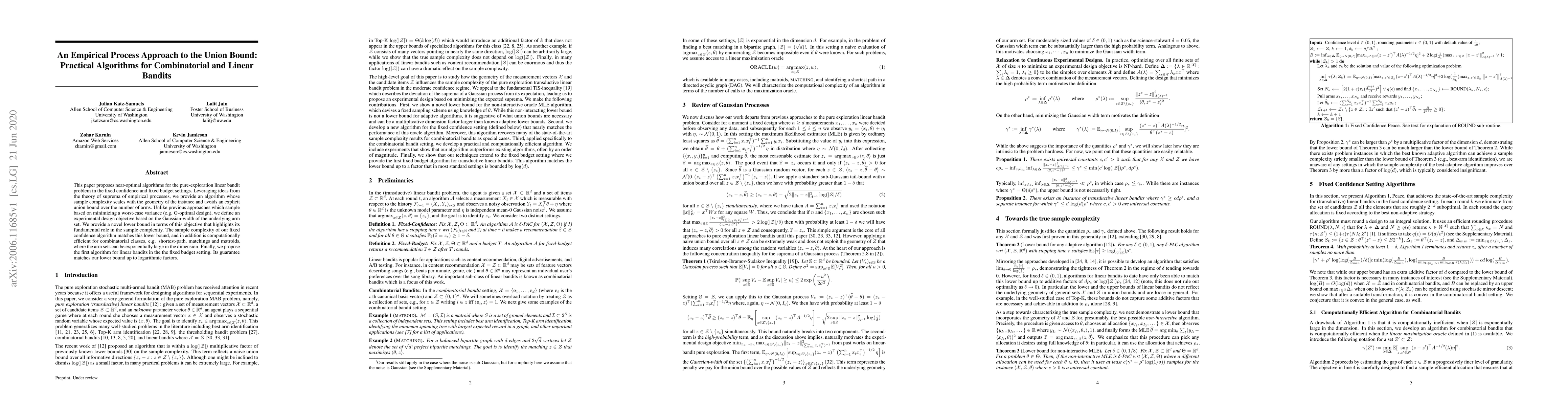 This paper proposes near-optimal algorithms for the pure-exploration linear bandit problem in the fixed confidence and fixed budget settings. Leveraging ideas from the theory of suprema of empirical processes, we provide an algorithm whose sample complexity scales with the geometry of the instance and avoids an explicit union bound over the number of arms. Unlike previous approaches which sample based on minimizing a worst-case variance (e.g. G-optimal design), we define an experimental design objective based on the Gaussian-width of the underlying arm set. We provide a novel lower bound in terms of this objective that highlights its fundamental role in the sample complexity. The sample complexity of our fixed confidence algorithm matches this lower bound, and in addition is computationally efficient for combinatorial classes, e.g. shortest-path, matchings and matroids, where the arm sets can be exponentially large in the dimension. Finally, we propose the first algorithm for linear bandits in the the fixed budget setting. Its guarantee matches our lower bound up to logarithmic factors.