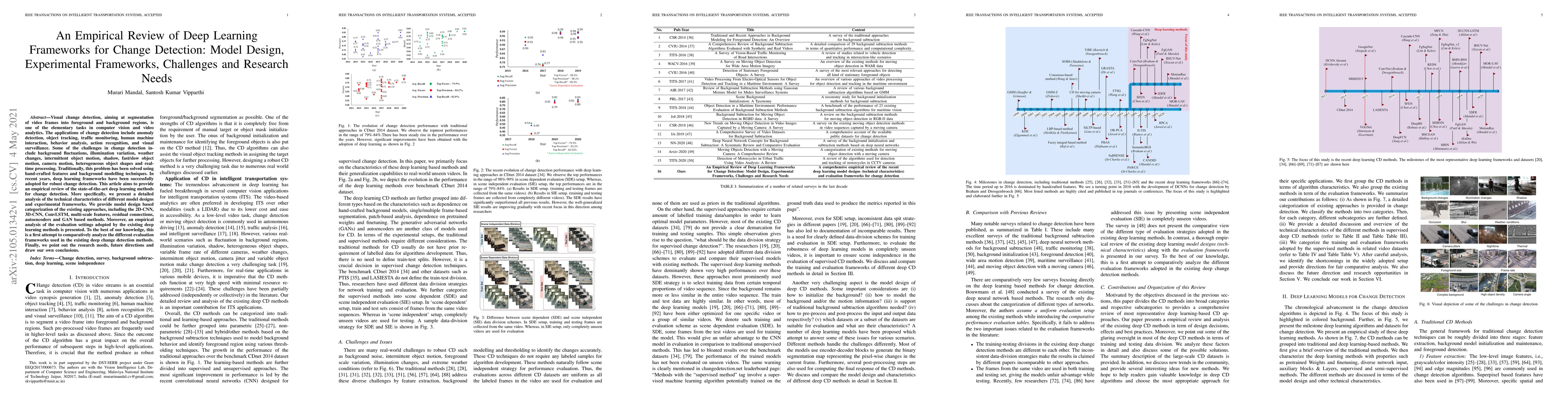 This paper provides an empirical review of deep learning frameworks for visual change detection, analyzing various model designs and experimental frameworks. It categorizes methods based on technical characteristics, including 2D-CNN, 3D-CNN, and GAN-based approaches, and discusses the challenges and research needs in the field.