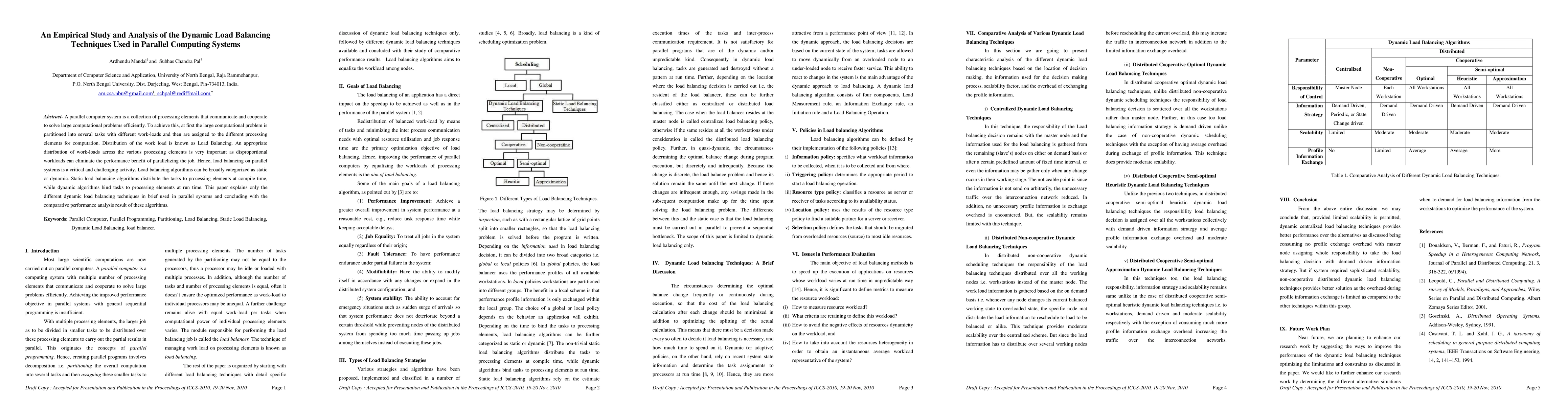 This paper reviews various dynamic load balancing techniques used in parallel computing systems to efficiently distribute workloads among processing elements, emphasizing their comparative performance analysis to enhance system efficiency. The study highlights the importance of dynamic load balancing in overcoming the challenges posed by uneven workloads.