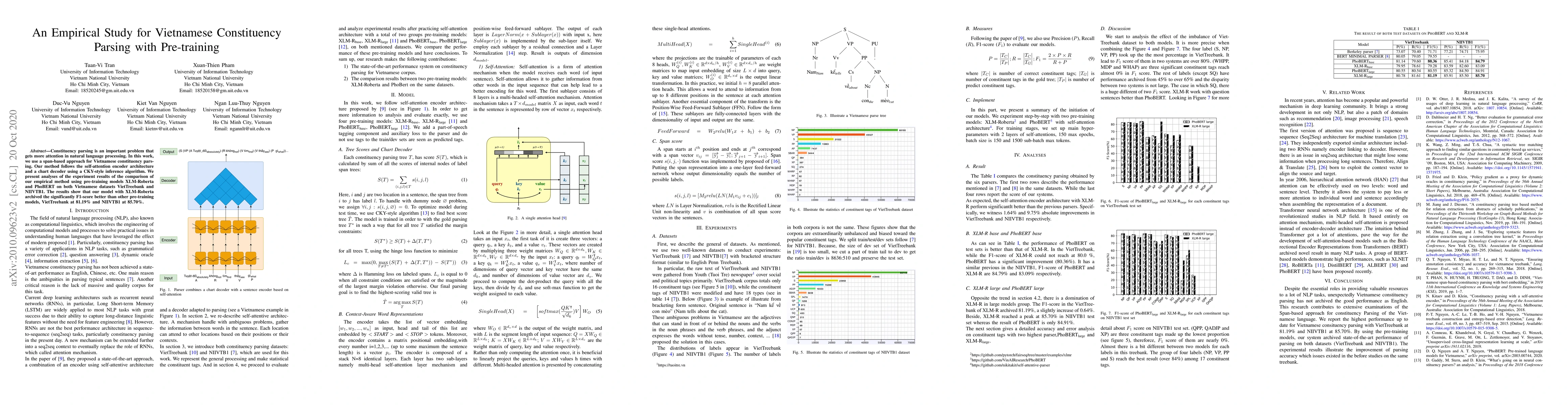This study employs a span-based approach for Vietnamese constituency parsing using self-attention encoders and CKY-style inference. Experiments comparing pre-trained models XLM-Roberta and PhoBERT on two datasets show that XLM-Roberta achieved superior F1 scores of 81.19% and 85.70% respectively.