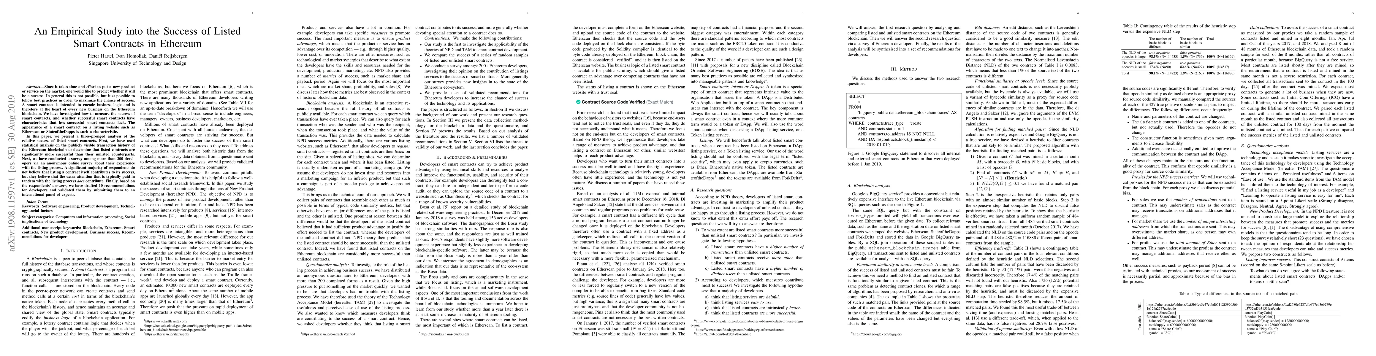 Since it takes time and effort to put a new product or service on the market, one would like to predict whether it will be a success. In general this is not possible, but it is possible to follow best practices in order to maximise the chance of success. A smart contract is intended to encode business logic and is therefore at the heart of every new business on the Ethereum blockchain. We have investigated how to measure the success of smart contracts, and whether successful smart contracts have characteristics that less successful smart contracts lack. The appearance of a smart contract on a listing website such as Etherscan or StateoftheDapps is such a characteristic. In this paper, we present a three-pronged analysis of the relative success of listed smart contracts. First, we have used statistical analysis on the publicly visible transaction history of the Ethereum blockchain to determine that listed contracts are significantly more successful than their unlisted counterparts. Next, we have conducted a survey among more than 200 developers via an anonymous online survey about their experience with the listing process. A significant majority of respondents do not believe that listing a contract itself contributes to its success, but they believe that the extra attention that is typically paid in tandem with the listing process does contribute. Finally, based on the respondents' answers, we have drafted 10 recommendations for developers and validated them by submitting them to an international panel of experts.