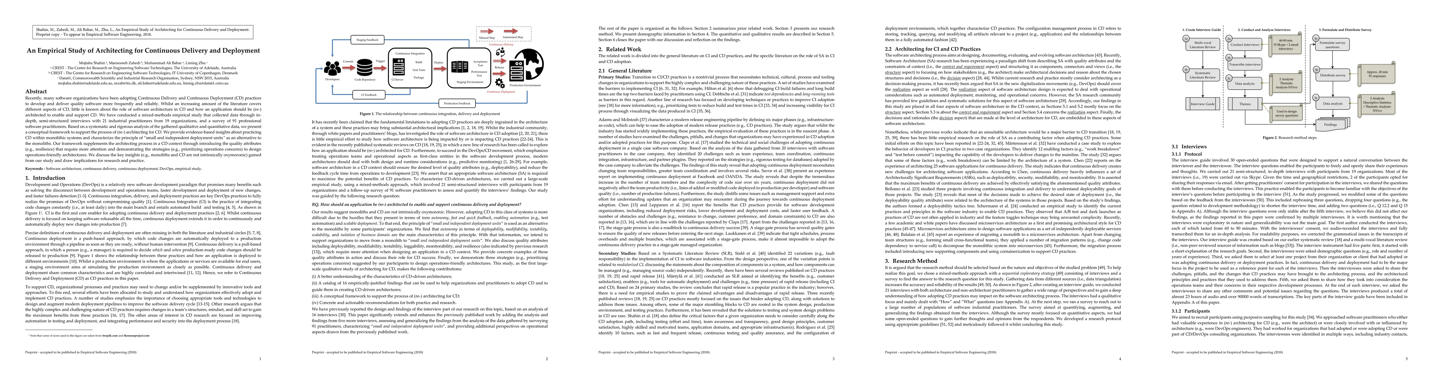 This study explores the role of software architecture in Continuous Delivery and Deployment (CD) practices through mixed-methods research involving interviews and surveys. It proposes a conceptual framework for architecting to support CD, emphasizing the importance of quality attributes and strategies for creating operations-friendly architectures.