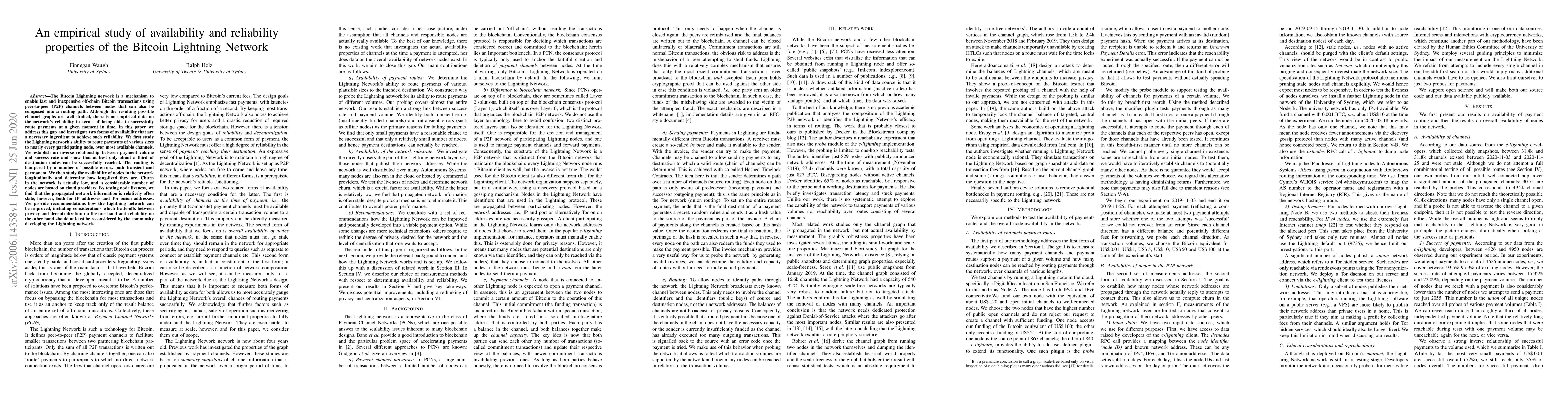 The paper presents an empirical study on the availability and reliability properties of the Bitcoin Lightning Network, providing insights into its performance for routing payments.