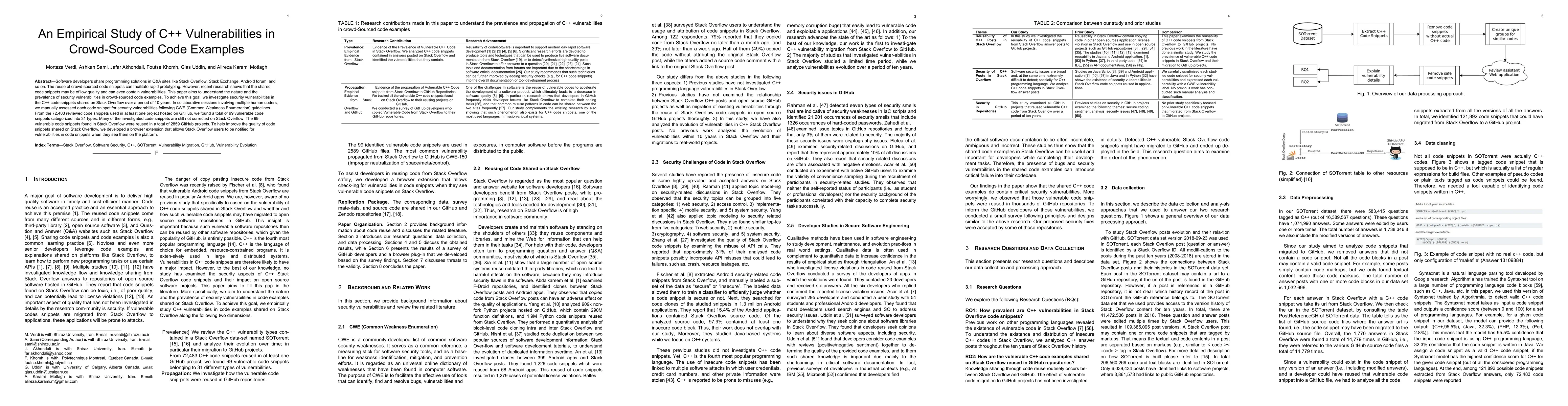This study investigates the prevalence of security vulnerabilities in C++ code snippets shared on Stack Overflow over a decade, finding 69 vulnerable snippets categorized into 29 types. To improve code quality, the researchers developed a browser extension for Stack Overflow users to check for vulnerabilities in shared code.