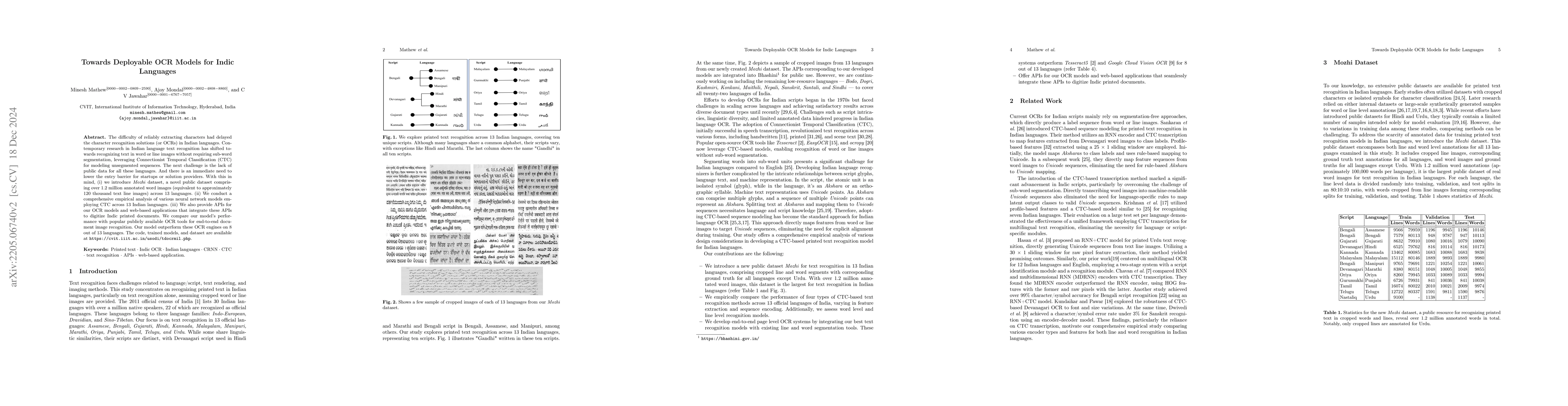 This paper conducts an empirical study of CTC-based models for OCR of 13 Indian languages, comparing various neural network architectures and their performance on word and line recognition. The study introduces a new dataset, Mozhi, with over 1.2 million annotated word images, and shows that the proposed models outperform existing OCR tools for 8 out of the 13 languages.