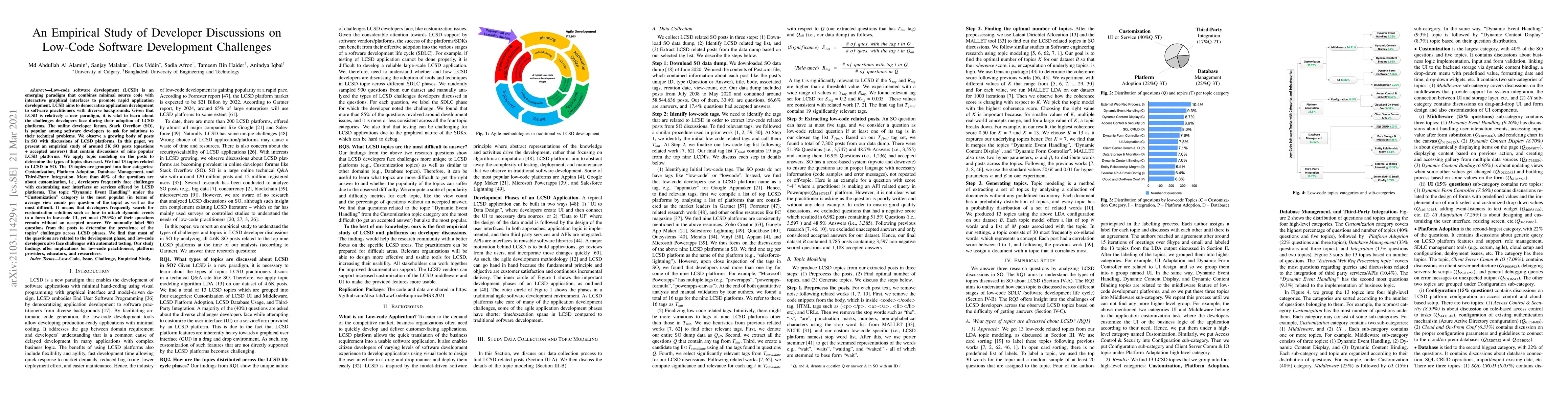 This paper conducts an empirical study on Stack Overflow posts discussing low-code software development platforms, identifying 13 topics grouped into four categories: Customization, Platform Adoption, Database Management, and Third-Party Integration. The study finds that over 40% of questions focus on customization challenges, with "Dynamic Event Handling" being the most difficult yet frequently discussed topic.