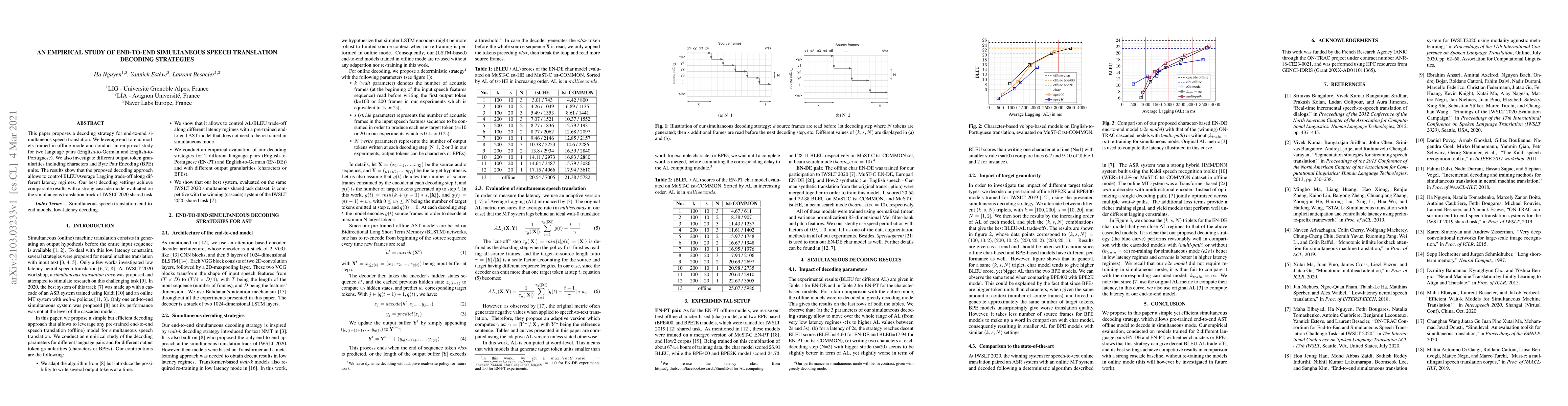 This paper proposes a decoding strategy for end-to-end simultaneous speech translation, demonstrating its effectiveness through empirical studies on English-to-German and English-to-Portuguese language pairs. The results indicate that the approach can balance BLEU scores and latency, achieving performance comparable to a strong cascade model.