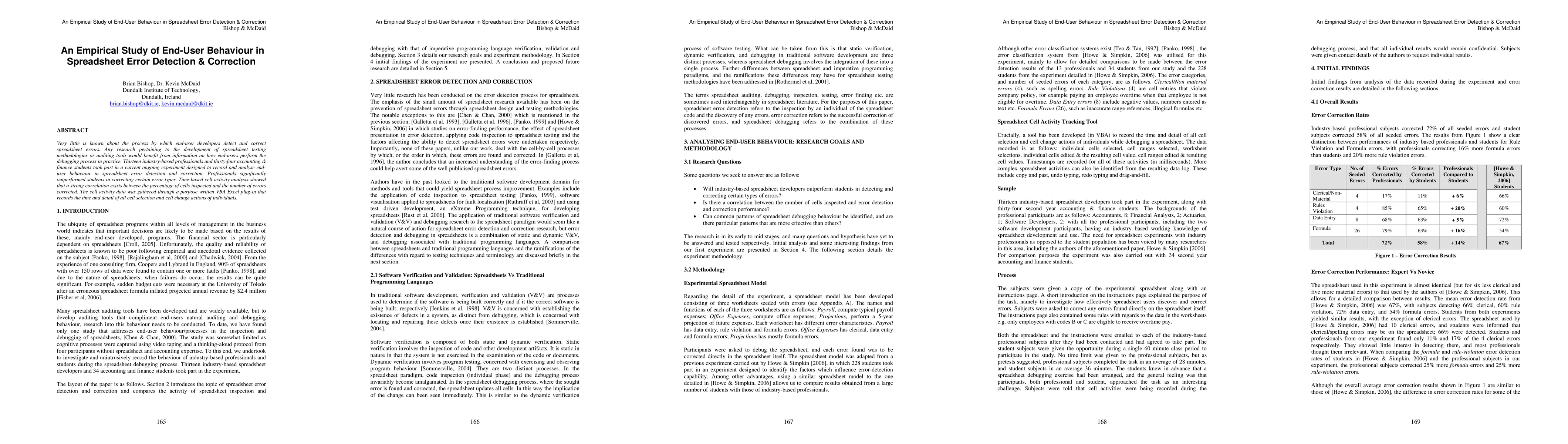 This study investigates how end-user developers detect and correct spreadsheet errors, finding that professionals outperform students in error correction. A VBA Excel plug-in recorded cell activity, revealing a strong correlation between the percentage of cells inspected and the number of errors corrected.