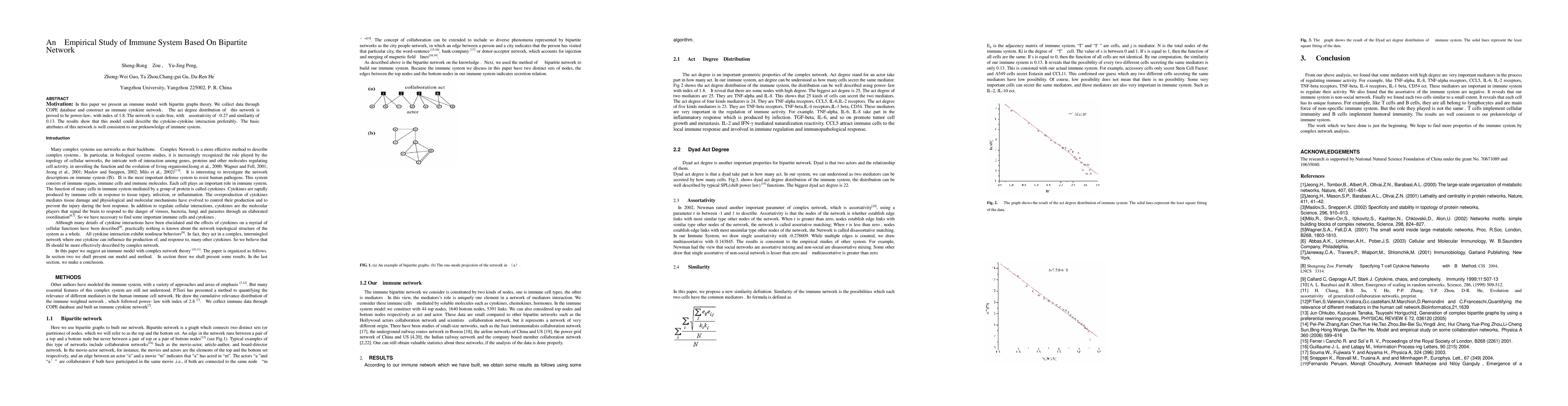 This study models the immune system using bipartite network theory, revealing a power-law distribution in the immune cell-mediator network. Key mediators like TNF-alpha and IL-8 are identified as crucial for regulating immune activity, highlighting the unique features of individual cells.
