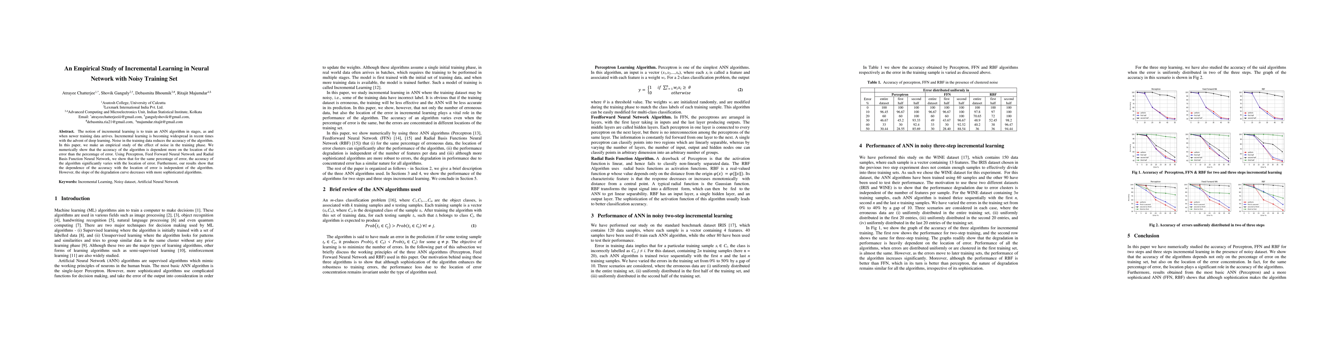 This paper investigates incremental learning in neural networks under noisy training conditions, demonstrating that accuracy is more affected by the location of errors rather than their percentage. It shows that sophisticated algorithms exhibit a lower slope of degradation in accuracy compared to simpler ones, regardless of error location.