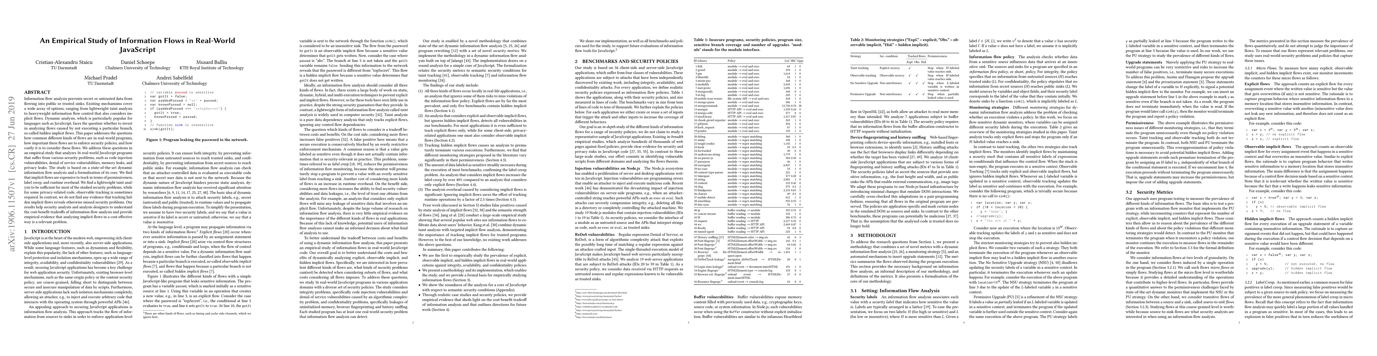 This empirical study analyzes 56 real-world JavaScript programs using dynamic information flow analysis to understand the prevalence and cost of different kinds of information flows.