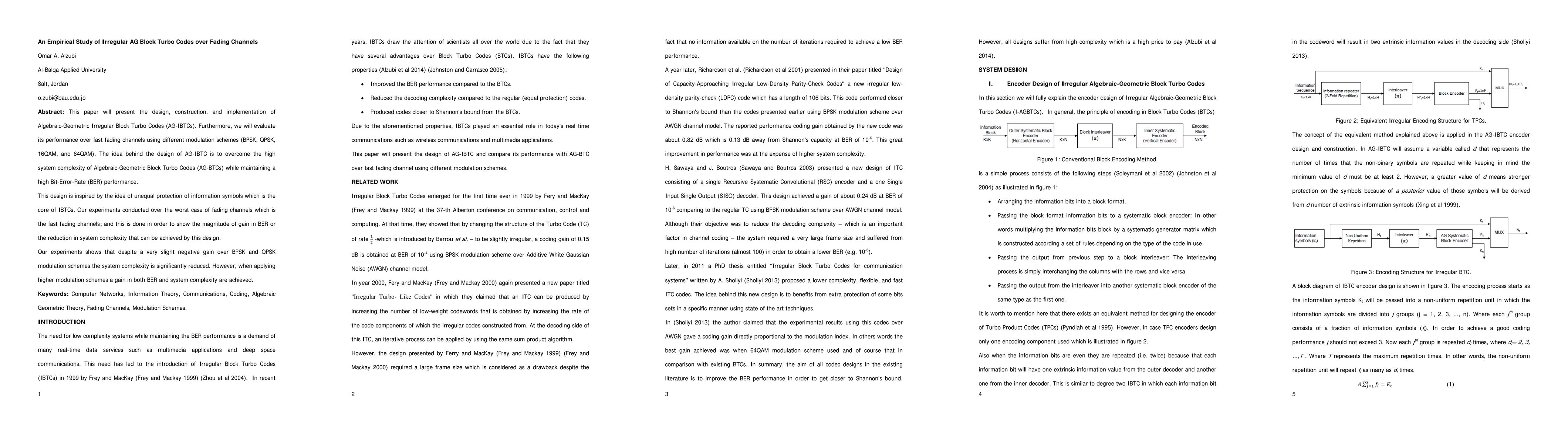This study designs and implements Algebraic Geometric Irregular Block Turbo Codes (AGIBTCs) to reduce system complexity while maintaining high Bit-Error Rate performance over fast fading channels. Experiments show slight complexity reduction with minor BER loss for lower modulation schemes, but significant gains in both BER and complexity for higher modulation schemes.