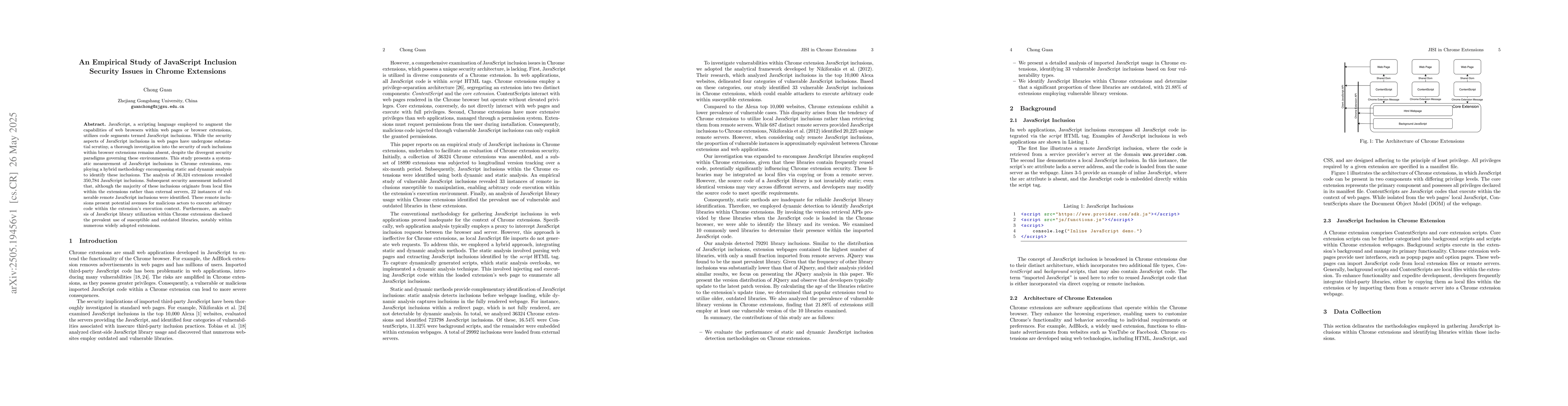This work is novel as it is the first empirical study to investigate JavaScript inclusion security issues specifically within Chrome extensions, uncovering previously unexplored vulnerabilities.