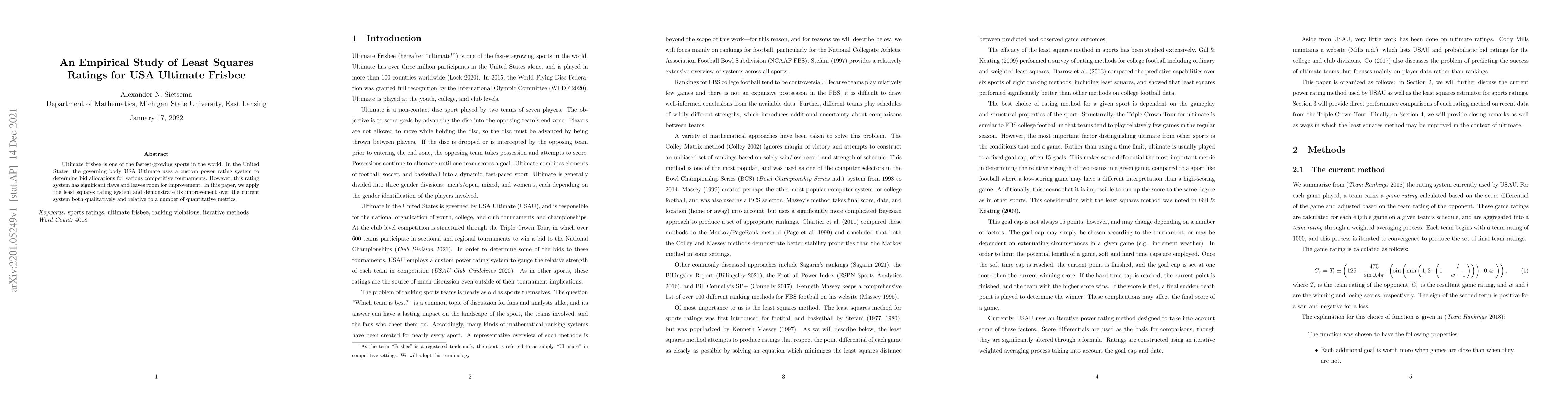 This research novelizes the application of least squares regression to ultimate frisbee ratings, providing a more accurate and robust alternative to existing methods.