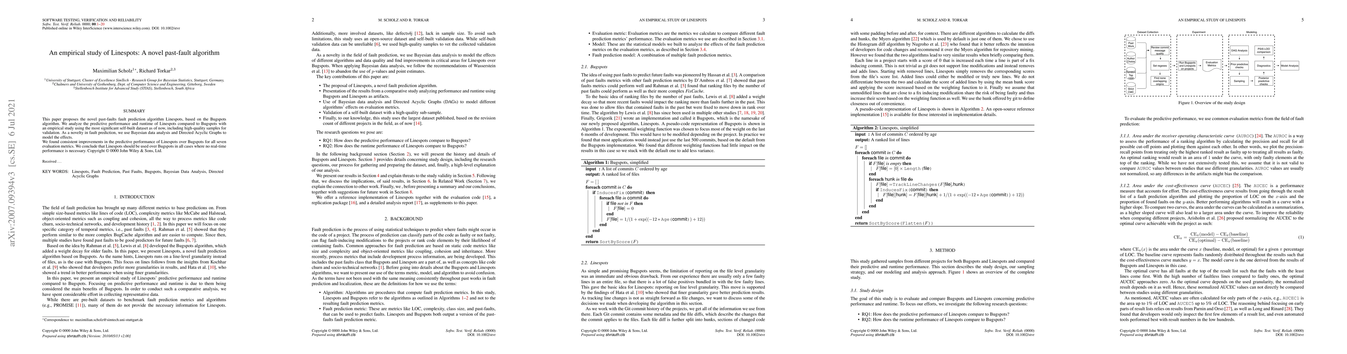 This study proposes Linespots, a novel variant of the Bugspots fault prediction algorithm, and evaluates it using an empirical study with a self-built dataset. The evaluation metrics include AUROC, EXAM, AUCEC5, AUCEC1, Einspect@10, Einspect@100, and EinspectF. Bayesian data analysis and Directed Acyclic Graphs (DAGs) are employed to model the effects.