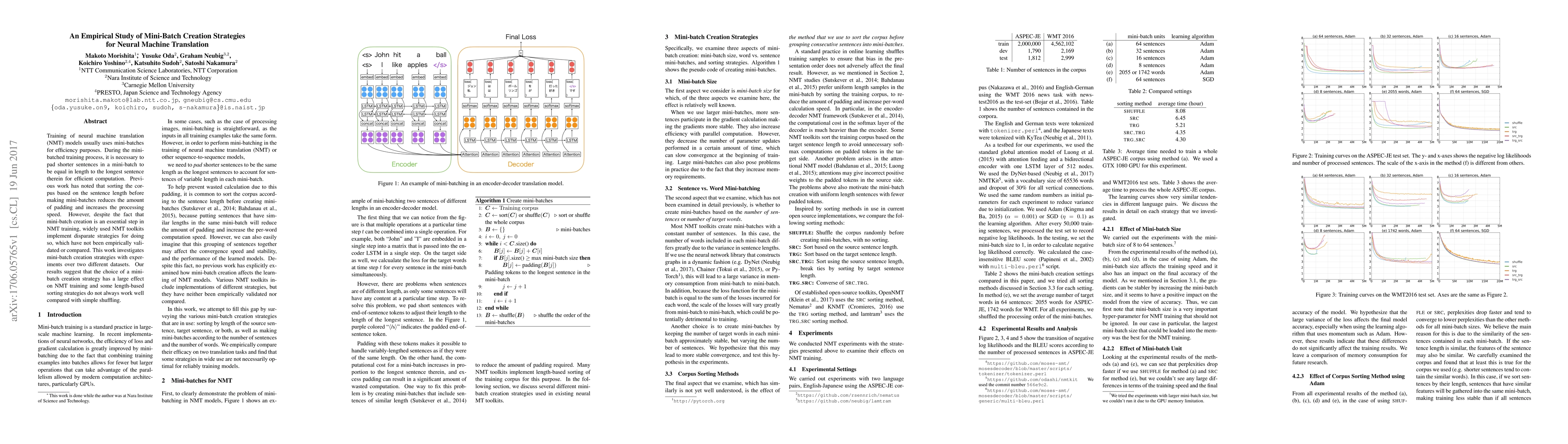 Training of neural machine translation (NMT) models usually uses mini-batches for efficiency purposes. During the mini-batched training process, it is necessary to pad shorter sentences in a mini-batch to be equal in length to the longest sentence therein for efficient computation. Previous work has noted that sorting the corpus based on the sentence length before making mini-batches reduces the amount of padding and increases the processing speed. However, despite the fact that mini-batch creation is an essential step in NMT training, widely used NMT toolkits implement disparate strategies for doing so, which have not been empirically validated or compared. This work investigates mini-batch creation strategies with experiments over two different datasets. Our results suggest that the choice of a mini-batch creation strategy has a large effect on NMT training and some length-based sorting strategies do not always work well compared with simple shuffling.