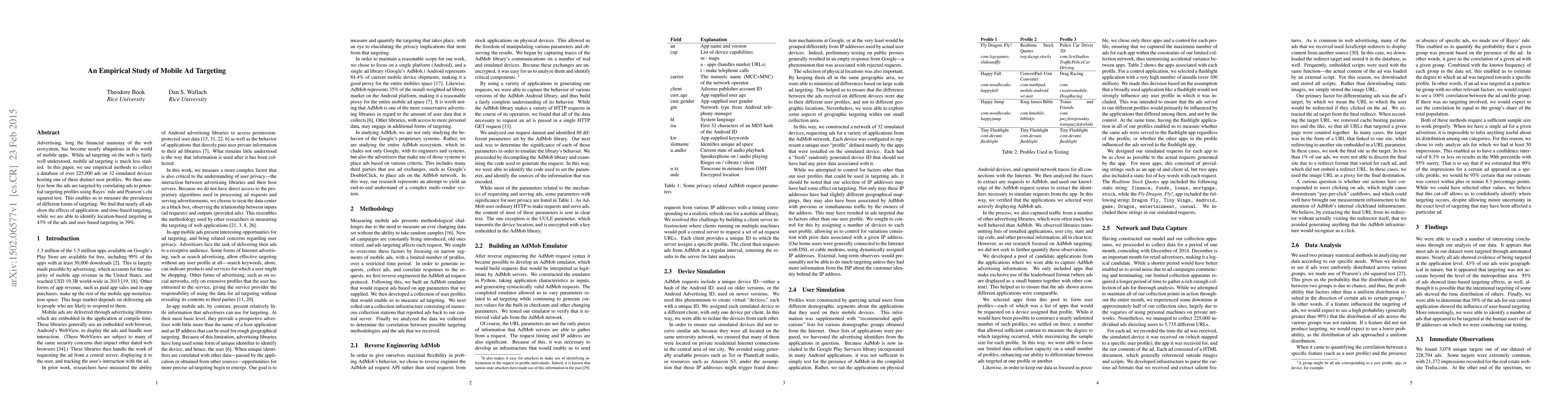 This paper empirically investigates mobile ad targeting by analyzing over 225,000 ads on simulated devices with distinct user profiles. It finds widespread application- and time-based targeting, with location-based targeting in 43% and user-based targeting in 39% of ads.