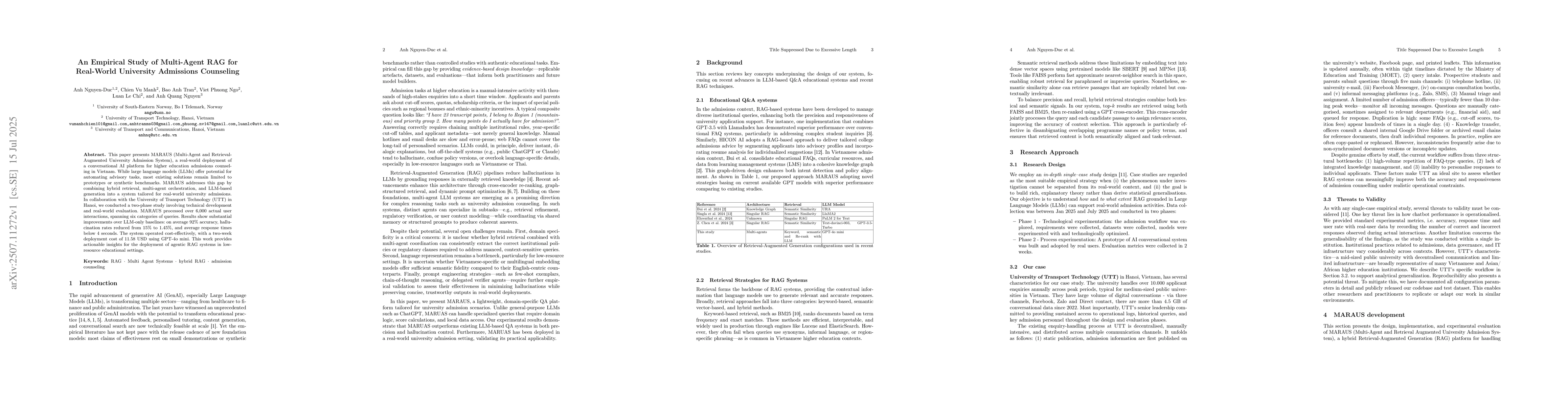 This paper presents MARAUS (Multi-Agent and Retrieval-Augmented University Admission System), a real-world deployment of a conversational AI platform for higher education admissions counseling in Vietnam. While large language models (LLMs) offer potential for automating advisory tasks, most existing solutions remain limited to prototypes or synthetic benchmarks. MARAUS addresses this gap by combining hybrid retrieval, multi-agent orchestration, and LLM-based generation into a system tailored for real-world university admissions. In collaboration with the University of Transport Technology (UTT) in Hanoi, we conducted a two-phase study involving technical development and real-world evaluation. MARAUS processed over 6,000 actual user interactions, spanning six categories of queries. Results show substantial improvements over LLM-only baselines: on average 92 percent accuracy, hallucination rates reduced from 15 precent to 1.45 percent, and average response times below 4 seconds. The system operated cost-effectively, with a two-week deployment cost of 11.58 USD using GPT-4o mini. This work provides actionable insights for the deployment of agentic RAG systems in low-resource educational settings.
