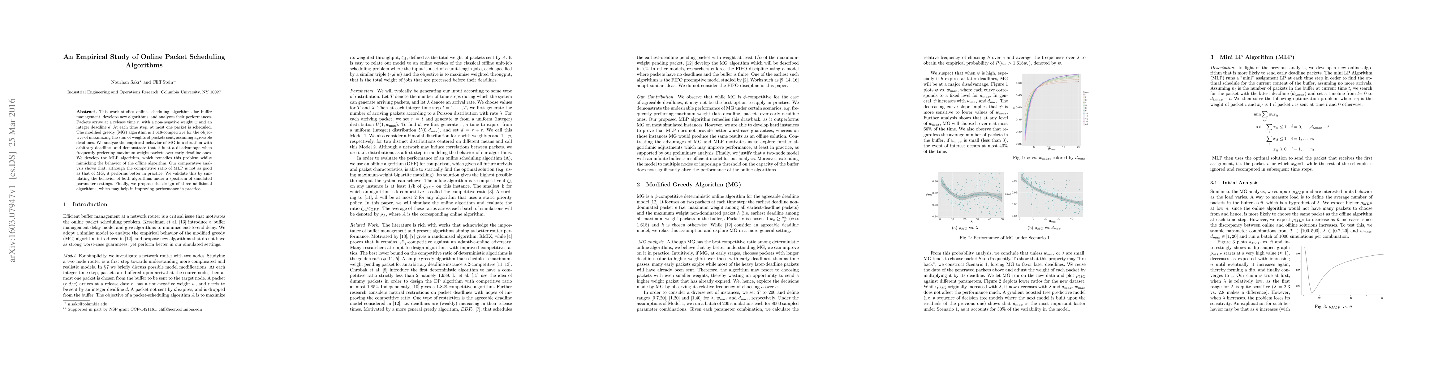 This work studies online scheduling algorithms for buffer management, develops new algorithms, and analyzes their performances. Packets arrive at a release time r, with a non-negative weight w and an integer deadline d. At each time step, at most one packet is scheduled. The modified greedy (MG) algorithm is 1.618-competitive for the objective of maximizing the sum of weights of packets sent, assuming agreeable deadlines. We analyze the empirical behavior of MG in a situation with arbitrary deadlines and demonstrate that it is at a disadvantage when frequently preferring maximum weight packets over early deadline ones. We develop the MLP algorithm, which remedies this problem whilst mimicking the behavior of the offline algorithm. Our comparative analysis shows that, although the competitive ratio of MLP is not as good as that of MG, it performs better in practice. We validate this by simulating the behavior of both algorithms under a spectrum of simulated parameter settings. Finally, we propose the design of three additional algorithms, which may help in improving performance in practice.
