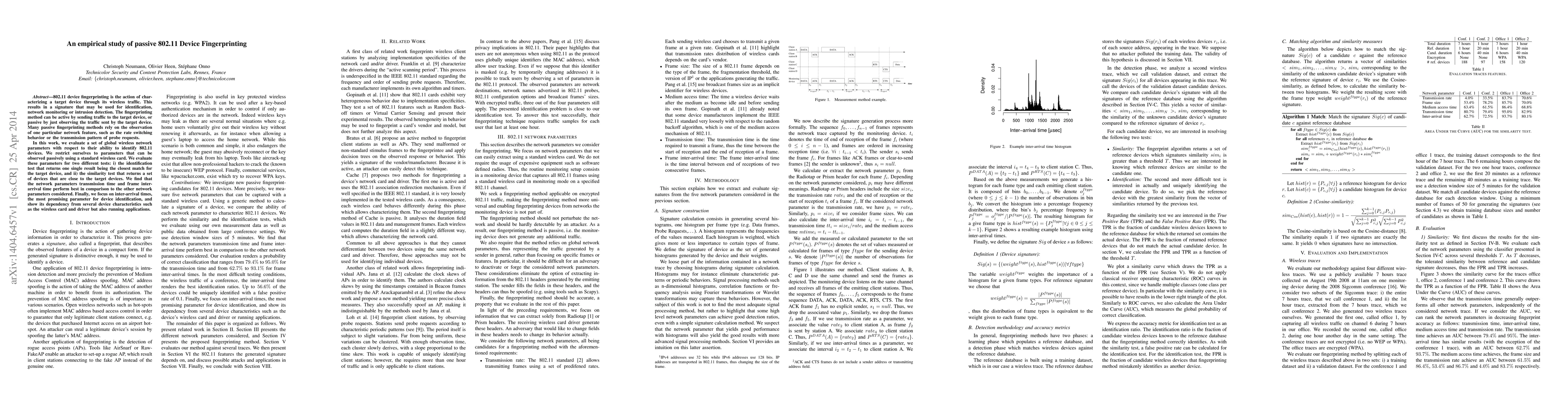 This paper evaluates passive 802.11 device fingerprinting methods based on global wireless network parameters, finding that transmission time and frame inter-arrival time are most effective. The study highlights inter-arrival times as the most promising parameter, noting its dependency on device characteristics like wireless cards and applications.