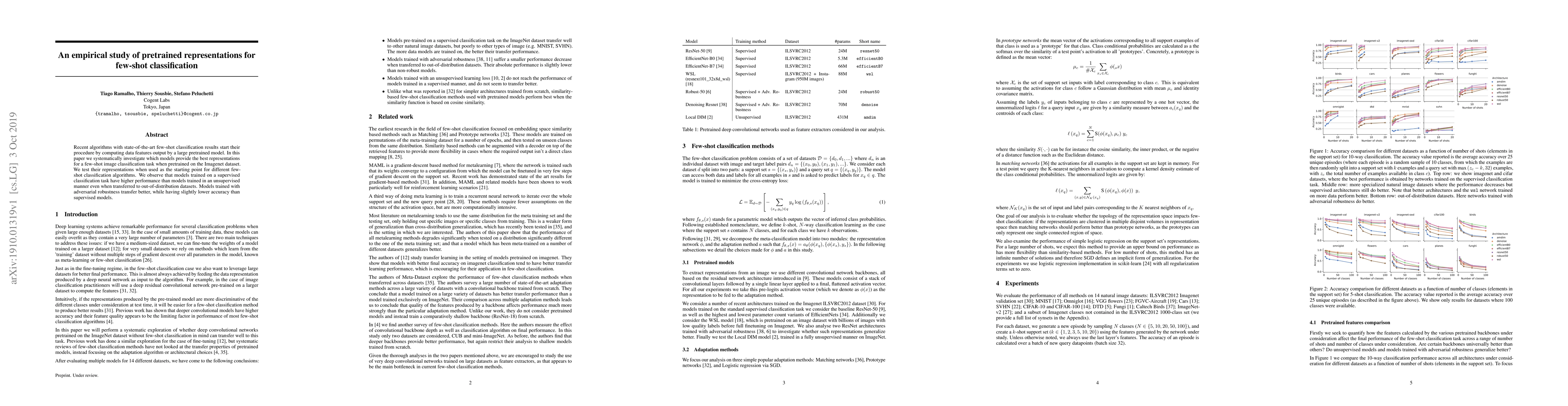 This paper systematically examines pretrained models' representations for few-shot image classification, finding that supervised models outperform unsupervised ones and that models trained for adversarial robustness show higher transferability despite slightly lower accuracy.