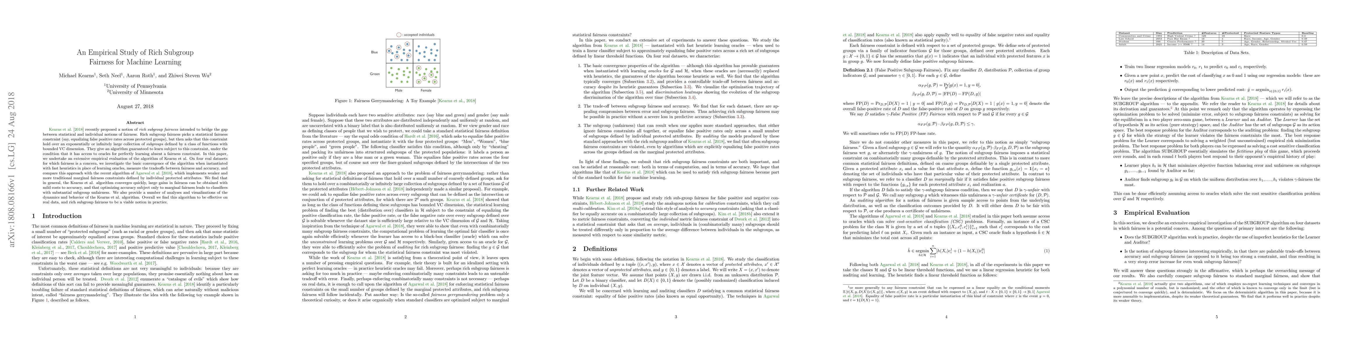 This paper empirically evaluates the Kearns et al. algorithm for rich subgroup fairness, finding it converges quickly and achieves significant fairness gains with only minor accuracy losses. It compares this approach to the Agarwal et al. algorithm, showing that marginal fairness leads to substantial subgroup unfairness.