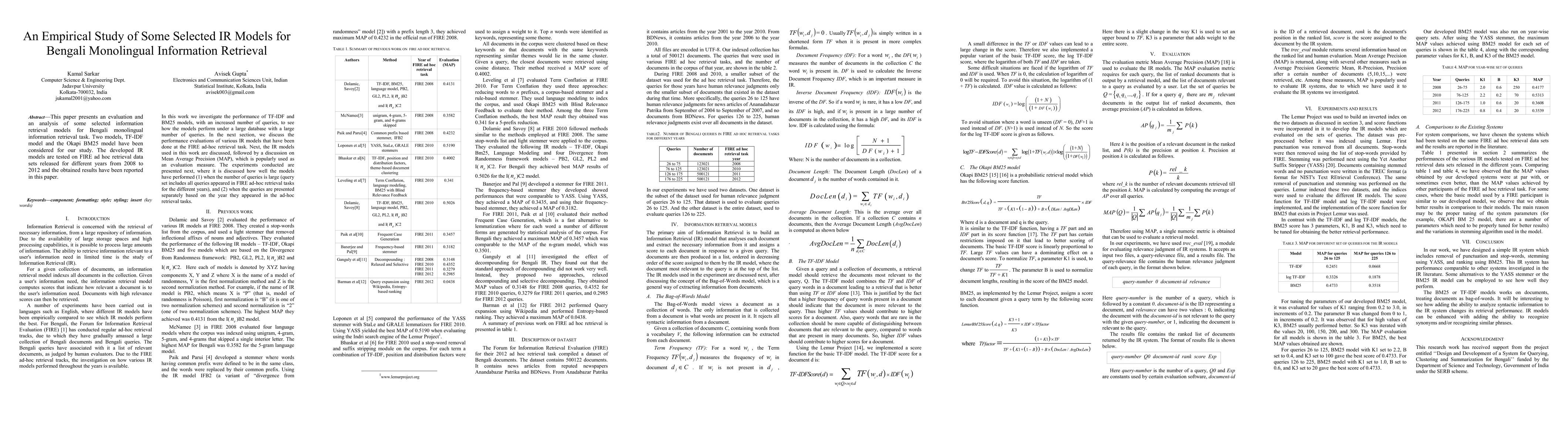 This paper presents an evaluation and an analysis of some selected information retrieval models for Bengali monolingual information retrieval task. Two models, TF-IDF model and the Okapi BM25 model have been considered for our study. The developed IR models are tested on FIRE ad hoc retrieval data sets released for different years from 2008 to 2012 and the obtained results have been reported in this paper.