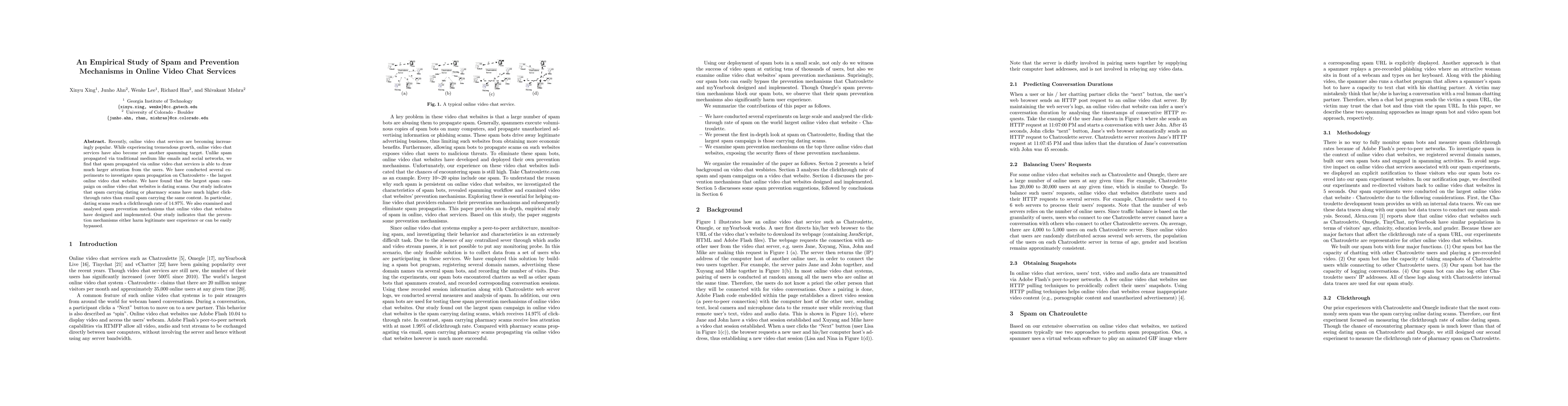 This study investigates spam propagation on online video chat services, focusing on Chatroulette, and finds that dating scams are the most prevalent form of spam, achieving a clickthrough rate of 14.97%. The research also evaluates existing spam prevention mechanisms, revealing that they often compromise user experience or are easily circumvented.