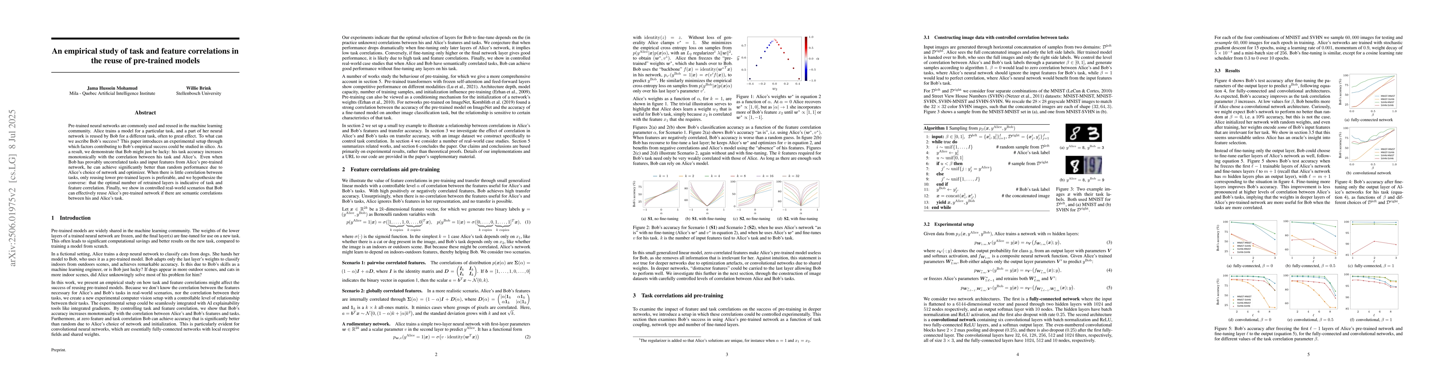 Pre-trained neural networks are commonly used and reused in the machine learning community. Alice trains a model for a particular task, and a part of her neural network is reused by Bob for a different task, often to great effect. To what can we ascribe Bob's success? This paper introduces an experimental setup through which factors contributing to Bob's empirical success could be studied in silico. As a result, we demonstrate that Bob might just be lucky: his task accuracy increases monotonically with the correlation between his task and Alice's. Even when Bob has provably uncorrelated tasks and input features from Alice's pre-trained network, he can achieve significantly better than random performance due to Alice's choice of network and optimizer. When there is little correlation between tasks, only reusing lower pre-trained layers is preferable, and we hypothesize the converse: that the optimal number of retrained layers is indicative of task and feature correlation. Finally, we show in controlled real-world scenarios that Bob can effectively reuse Alice's pre-trained network if there are semantic correlations between his and Alice's task.