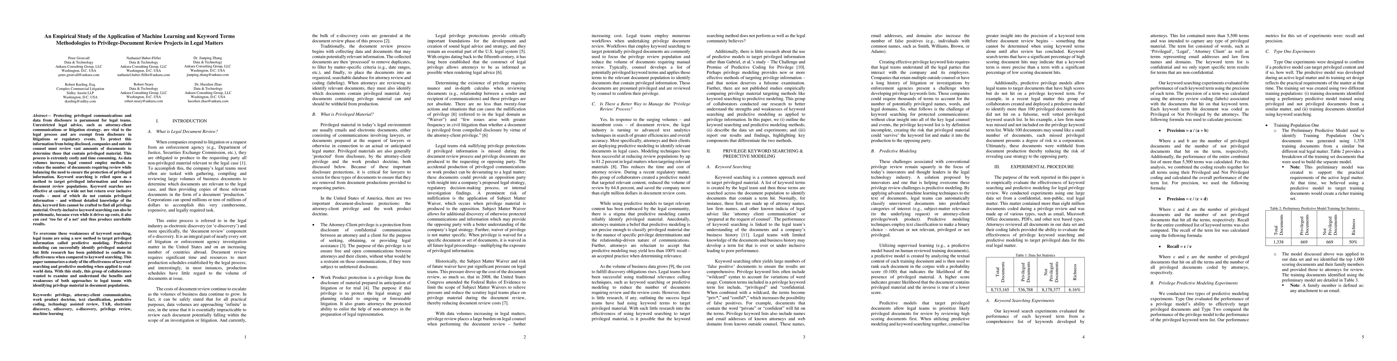 Protecting privileged communications and data from disclosure is paramount for legal teams. Unrestricted legal advice, such as attorney-client communications or litigation strategy. are vital to the legal process and are exempt from disclosure in litigations or regulatory events. To protect this information from being disclosed, companies and outside counsel must review vast amounts of documents to determine those that contain privileged material. This process is extremely costly and time consuming. As data volumes increase, legal counsel employ methods to reduce the number of documents requiring review while balancing the need to ensure the protection of privileged information. Keyword searching is relied upon as a method to target privileged information and reduce document review populations. Keyword searches are effective at casting a wide net but return over inclusive results -- most of which do not contain privileged information -- and without detailed knowledge of the data, keyword lists cannot be crafted to find all privilege material. Overly-inclusive keyword searching can also be problematic, because even while it drives up costs, it also can cast `too far of a net' and thus produce unreliable results.To overcome these weaknesses of keyword searching, legal teams are using a new method to target privileged information called predictive modeling. Predictive modeling can successfully identify privileged material but little research has been published to confirm its effectiveness when compared to keyword searching. This paper summarizes a study of the effectiveness of keyword searching and predictive modeling when applied to real-world data. With this study, this group of collaborators wanted to examine and understand the benefits and weaknesses of both approaches to legal teams with identifying privilege material in document populations.