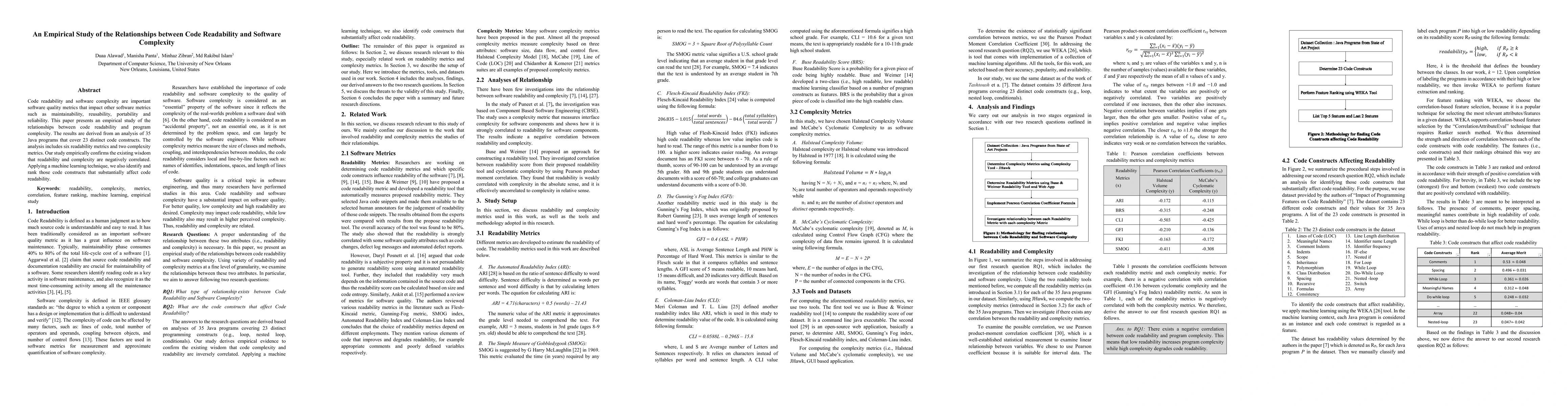 This paper empirically investigates the relationship between code readability and software complexity using 35 Java programs. It confirms that higher readability generally correlates with lower complexity, and identifies specific code constructs that significantly impact readability through machine learning analysis.