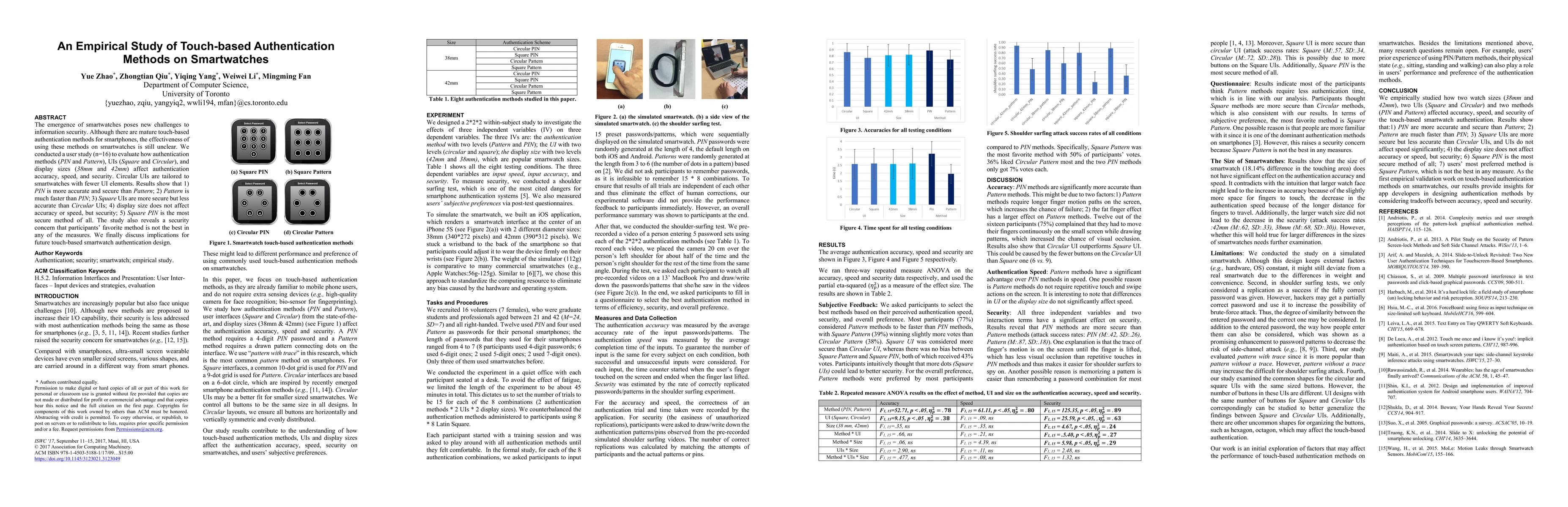 Empirical study validating touch-based authentication methods on smartwatches, analyzing the impact of authentication methods, UIs, and display sizes on accuracy, speed, and security.