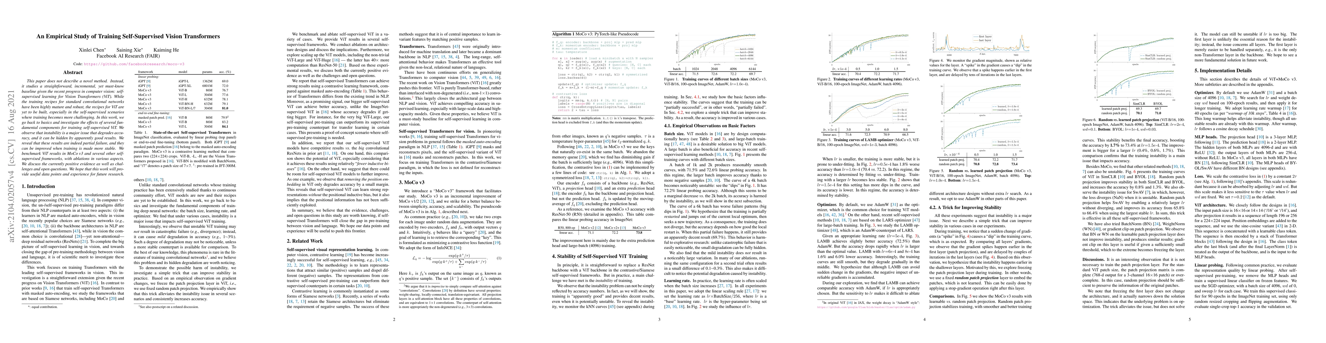 This paper investigates the training of self-supervised Vision Transformers (ViT), highlighting the instability issues that degrade accuracy and proposing methods to improve training stability. It benchmarks ViT results across various self-supervised frameworks and provides insights for future research.