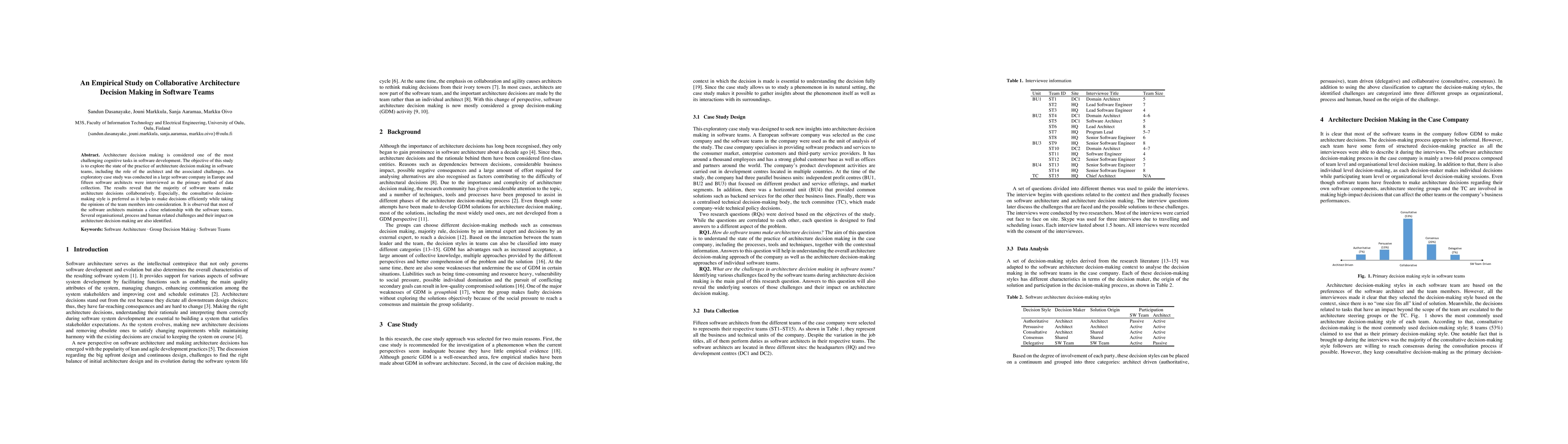 This study explores collaborative architecture decision-making in software teams through interviews with architects in a large European company, finding collaborative and consultative styles are preferred, while highlighting associated organizational and process challenges.