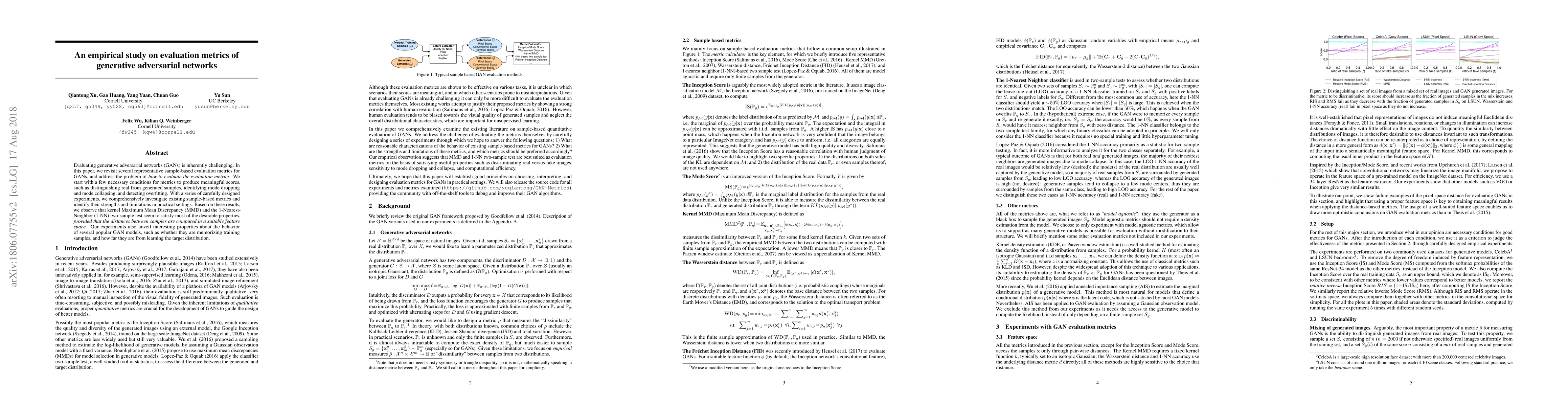 This paper evaluates various sample-based metrics for assessing generative adversarial networks (GANs), identifying kernel Maximum Mean Discrepancy (MMD) and 1-Nearest-Neighbor (1-NN) tests as effective due to their ability to distinguish real from generated samples and detect issues like mode dropping. The study reveals insights into popular GAN models' performance and learning behaviors.