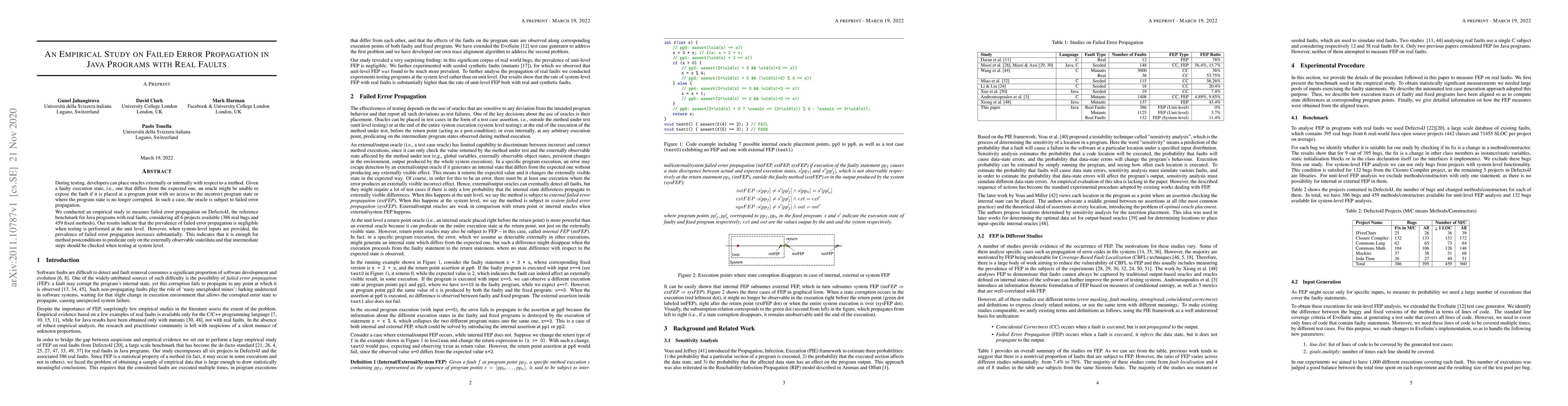 This study investigates failed error propagation in Java programs using Defects4J, finding that it is rare in unit testing but significantly increases with system-level inputs, suggesting that external state checks are sufficient for unit tests but intermediate state checks are necessary for system-level tests.