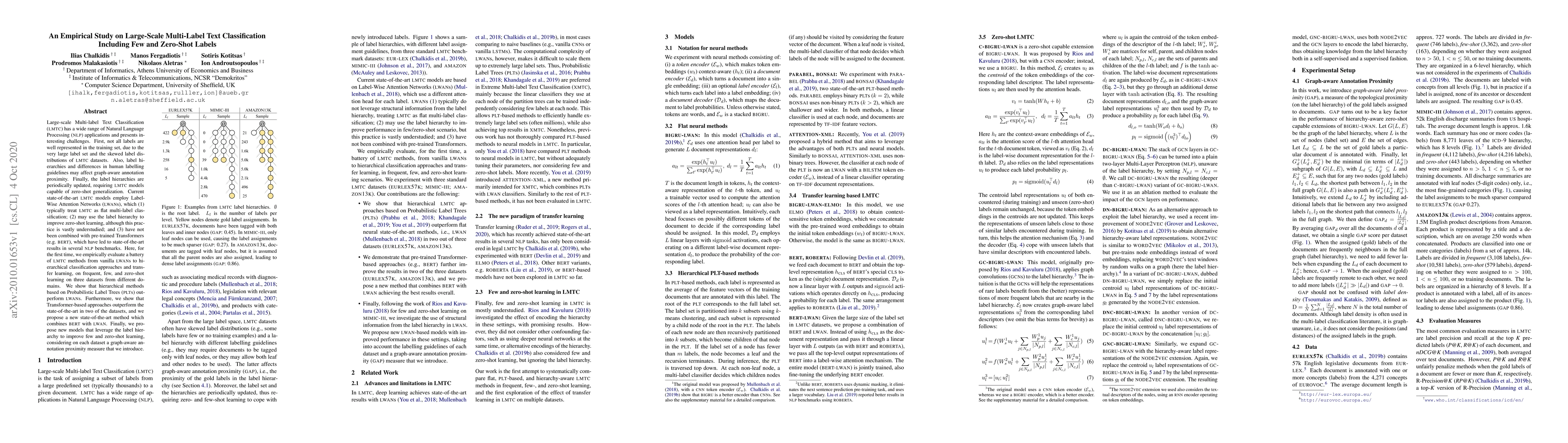 This paper evaluates various methods for large-scale multi-label text classification, focusing on few and zero-shot labels. It finds that hierarchical methods using Probabilistic Label Trees and Transformer-based approaches, especially a new method combining BERT with Label-Wise Attention Networks, outperform existing models across different datasets.
