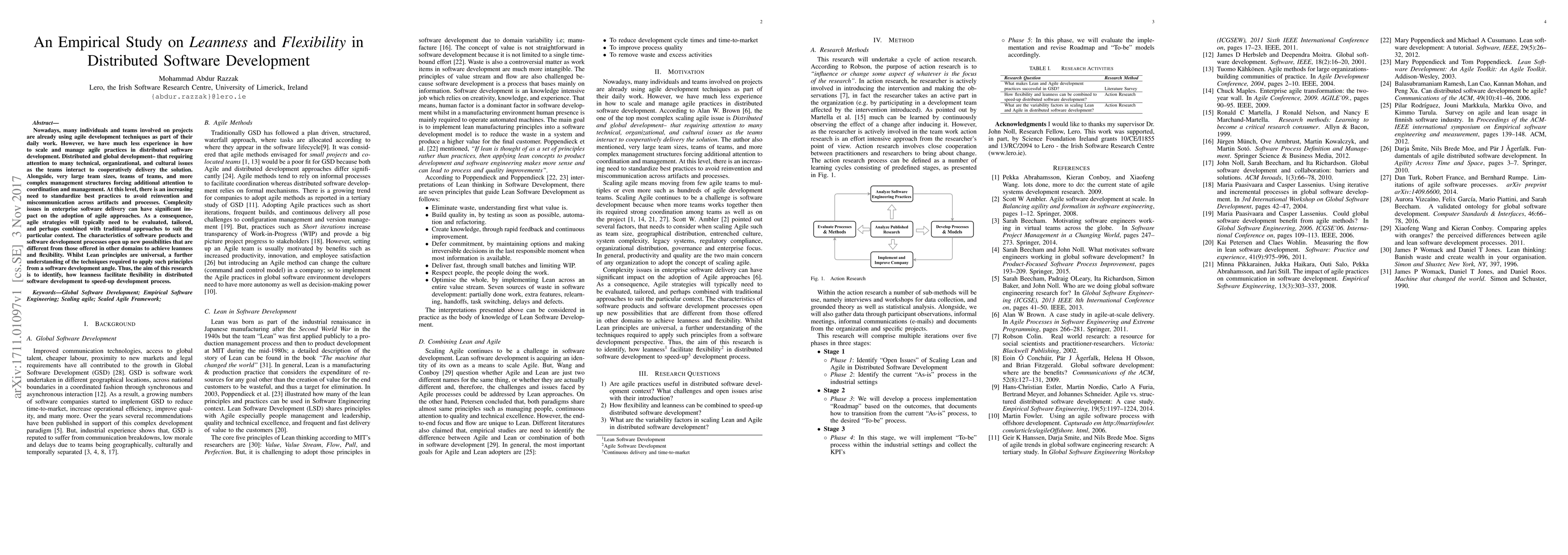 Action Research methodology was used to investigate how flexibility and lean development practices can be combined to speed up distributed software development.
