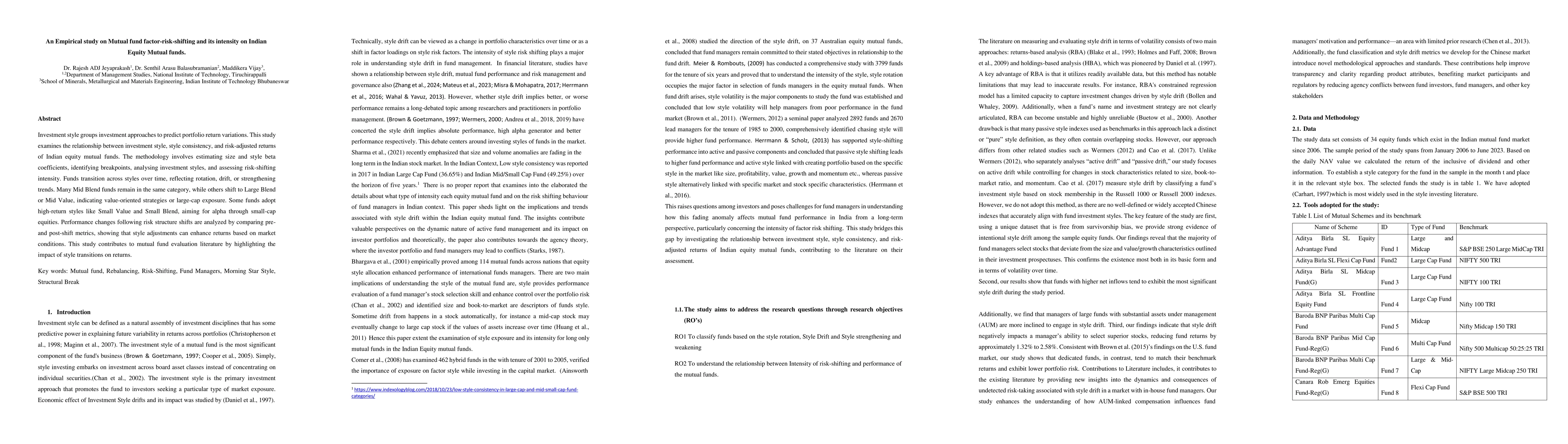 The study employs a combination of beta coefficient estimation, structural break analysis using the Bai-Perron procedure, and performance comparison metrics to assess mutual fund style shifts and their impact on returns. It utilizes Fama-French 3-factor and AGT models for alpha calculation and evaluates funds based on risk-adjusted returns.