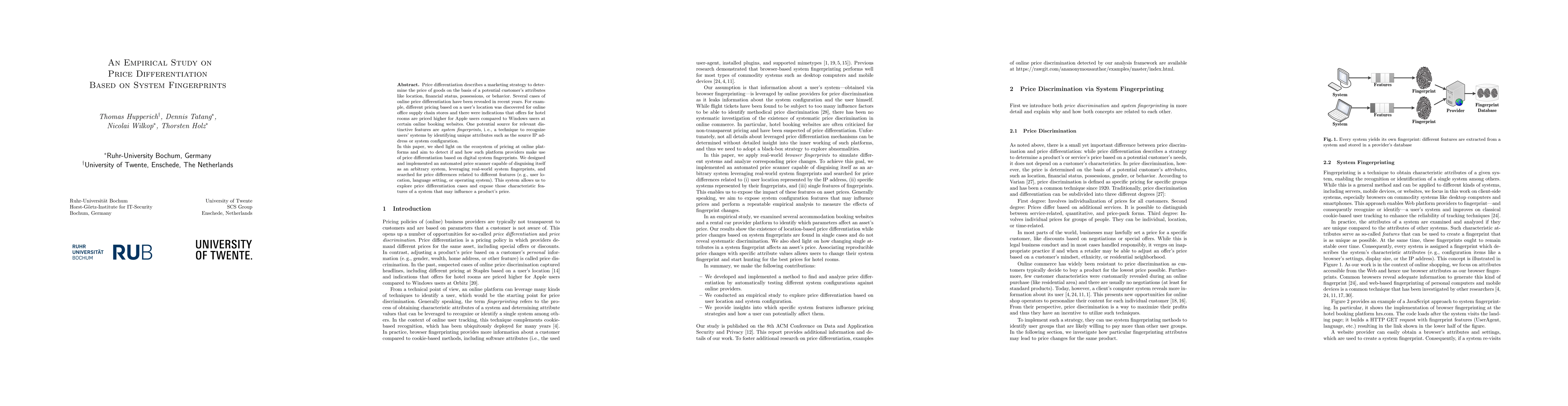 This paper investigates online price differentiation based on system fingerprints, revealing how online platforms may use unique user system attributes to set different prices. The study employs an automated price scanner to disguise system features and identifies price variations linked to user location, language, and operating system.