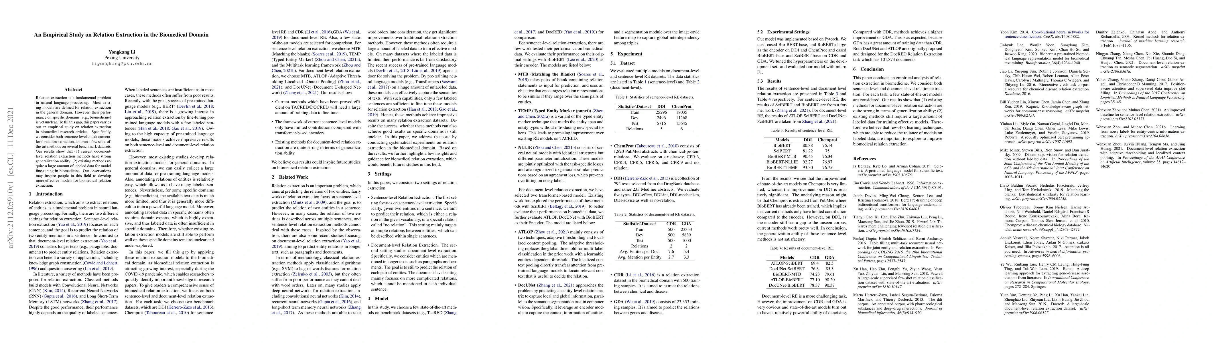 Relation extraction is a fundamental problem in natural language processing. Most existing models are defined for relation extraction in the general domain. However, their performance on specific domains (e.g., biomedicine) is yet unclear. To fill this gap, this paper carries out an empirical study on relation extraction in biomedical research articles. Specifically, we consider both sentence-level and document-level relation extraction, and run a few state-of-the-art methods on several benchmark datasets. Our results show that (1) current document-level relation extraction methods have strong generalization ability; (2) existing methods require a large amount of labeled data for model fine-tuning in biomedicine. Our observations may inspire people in this field to develop more effective models for biomedical relation extraction.
