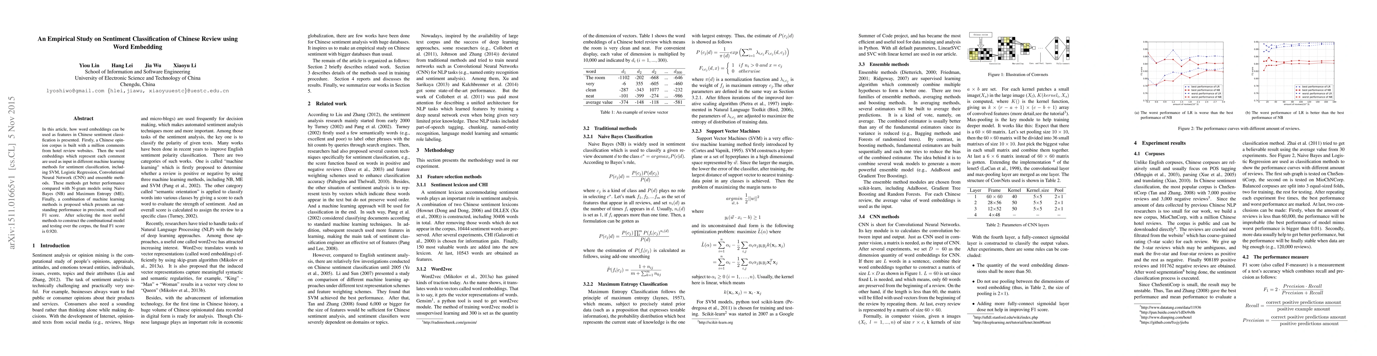 This study investigates using word embeddings to improve sentiment classification of Chinese reviews, achieving a high accuracy of 0.920 with an ensemble model.