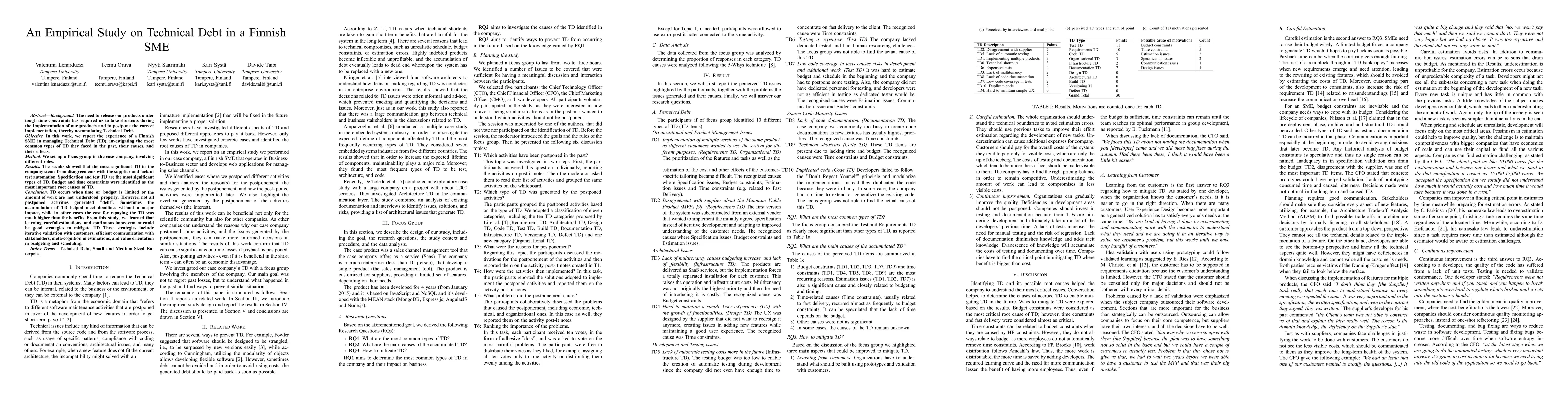 A Finnish SME studied its technical debt management practices, finding that specification and test issues were the most significant types of debt, with budget and time constraints being major root causes. The study suggests learning, estimation improvement, and value-oriented planning can mitigate technical debt.