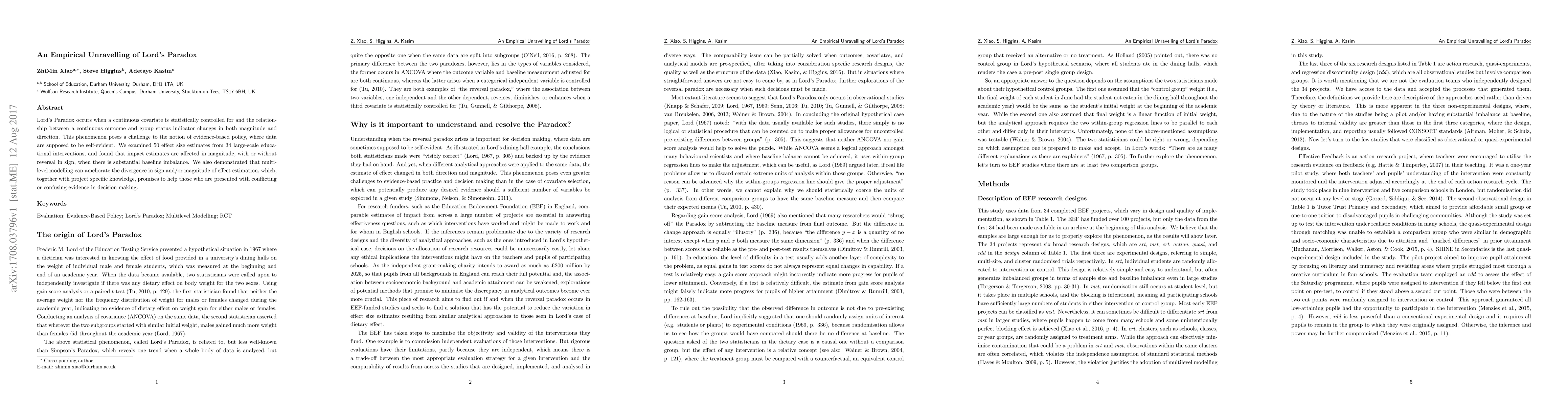 Lord's Paradox occurs when a continuous covariate is statistically controlled for and the relationship between a continuous outcome and group status indicator changes in both magnitude and direction. This phenomenon poses a challenge to the notion of evidence-based policy, where data are supposed to be self-evident. We examined 50 effect size estimates from 34 large-scale educational interventions, and found that impact estimates are affected in magnitude, with or without reversal in sign, when there is substantial baseline imbalance. We also demonstrated that multilevel modelling can ameliorate the divergence in sign and/or magnitude of effect estimation, which, together with project specific knowledge, promises to help those who are presented with conflicting or confusing evidence in decision making.