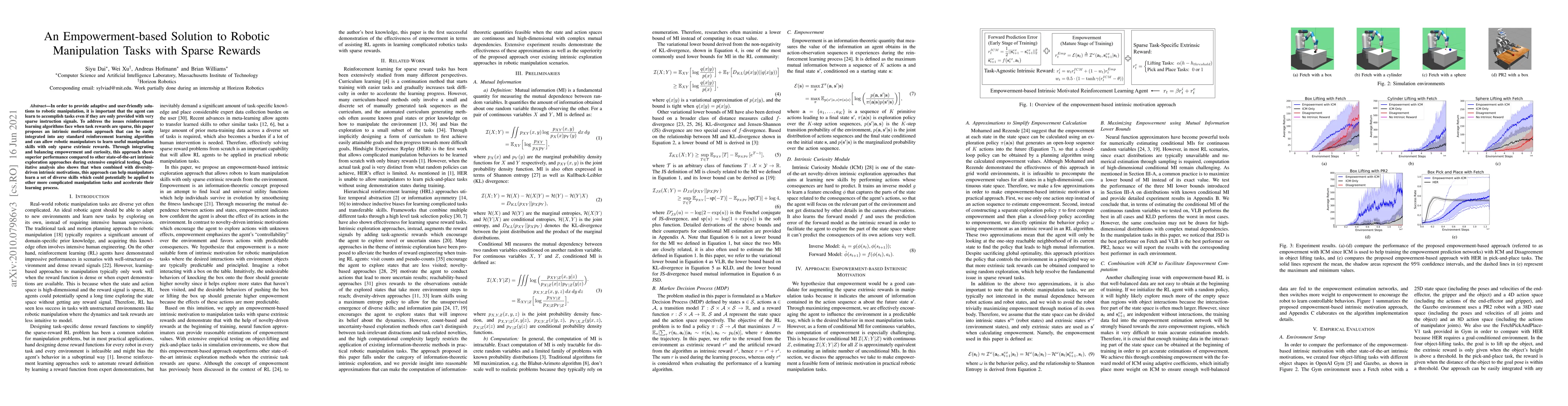 In order to provide adaptive and user-friendly solutions to robotic manipulation, it is important that the agent can learn to accomplish tasks even if they are only provided with very sparse instruction signals. To address the issues reinforcement learning algorithms face when task rewards are sparse, this paper proposes an intrinsic motivation approach that can be easily integrated into any standard reinforcement learning algorithm and can allow robotic manipulators to learn useful manipulation skills with only sparse extrinsic rewards. Through integrating and balancing empowerment and curiosity, this approach shows superior performance compared to other state-of-the-art intrinsic exploration approaches during extensive empirical testing. Qualitative analysis also shows that when combined with diversity-driven intrinsic motivations, this approach can help manipulators learn a set of diverse skills which could potentially be applied to other more complicated manipulation tasks and accelerate their learning process.
