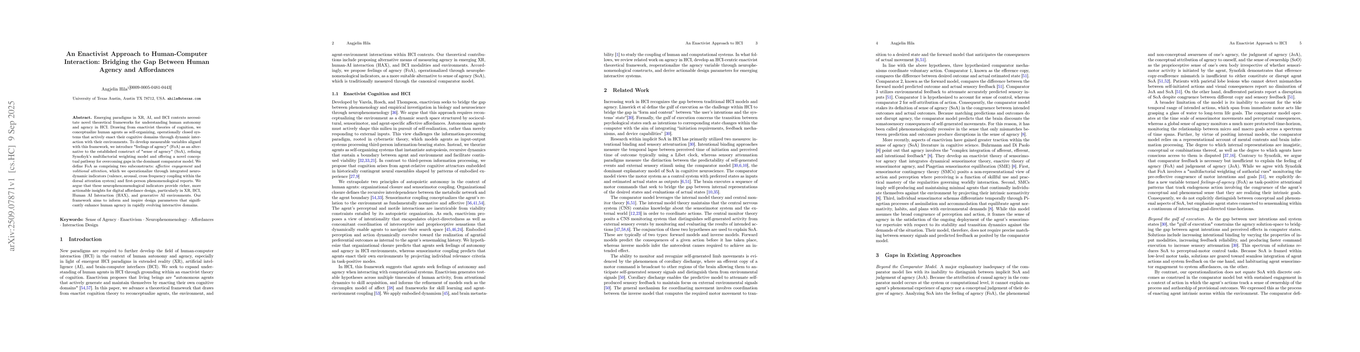 Emerging paradigms in XR, AI, and BCI contexts necessitate novel theoretical frameworks for understanding human autonomy and agency in HCI. Drawing from enactivist theories of cognition, we conceptualize human agents as self-organizing, operationally closed systems that actively enact their cognitive domains through dynamic interaction with their environments. To develop measurable variables aligned with this framework, we introduce "feelings of agency" (FoA) as an alternative to the established construct of "sense of agency" (SoA), refining Synofzyk's multifactorial weighting model and offering a novel conceptual pathway for overcoming gaps in the dominant comparator model. We define FoA as comprising two subconstructs: affective engagement and volitional attention, which we operationalize through integrated neurodynamic indicators (valence, arousal, cross frequency coupling within the dorsal attention system) and first-person phenomenological reports. We argue that these neurophenomenological indicators provide richer, more actionable insights for digital affordance design, particularly in XR, BCI, Human AI Interaction (HAX), and generative AI environments. Our framework aims to inform and inspire design parameters that significantly enhance human agency in rapidly evolving interactive domains.